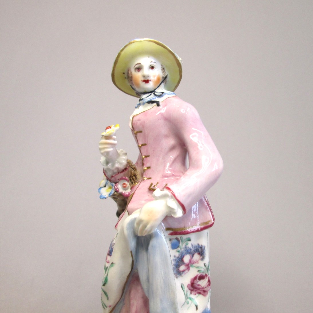 A Bow Porcelain Figure of a Lady standing with a basket of flowers over her right arm and holding a single yellow flower in her hand, this figure is representing one of the season’s Spring