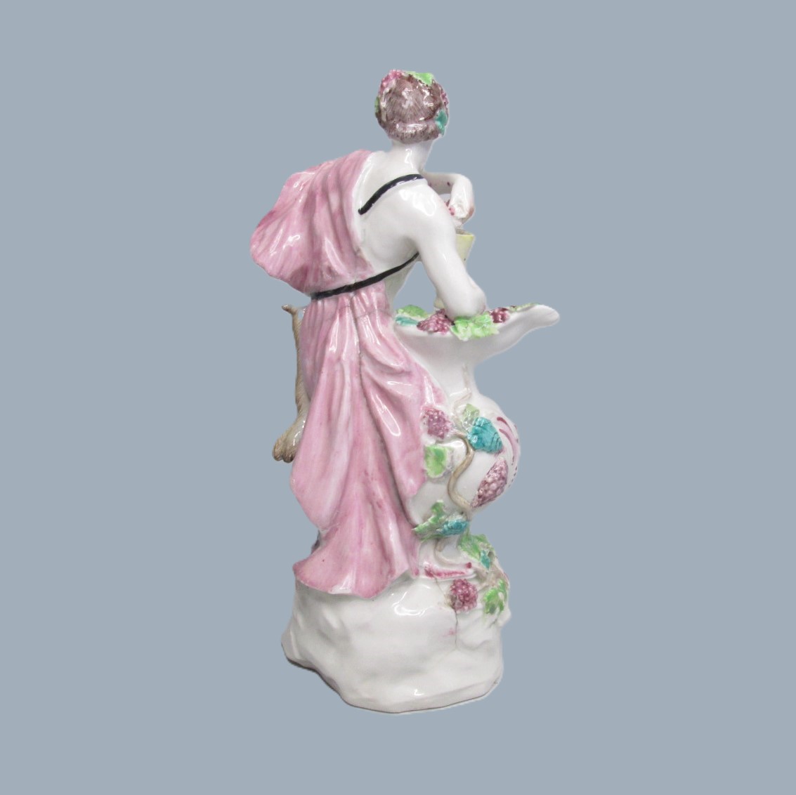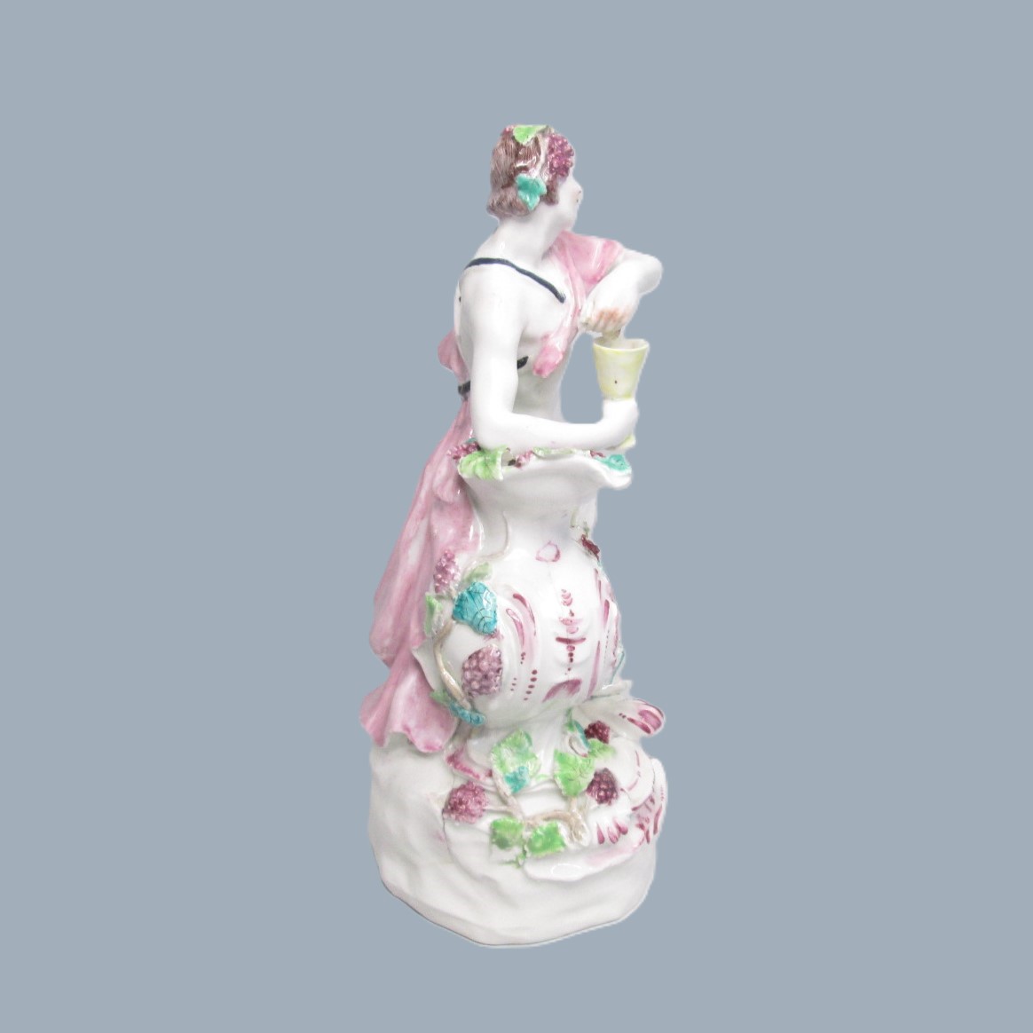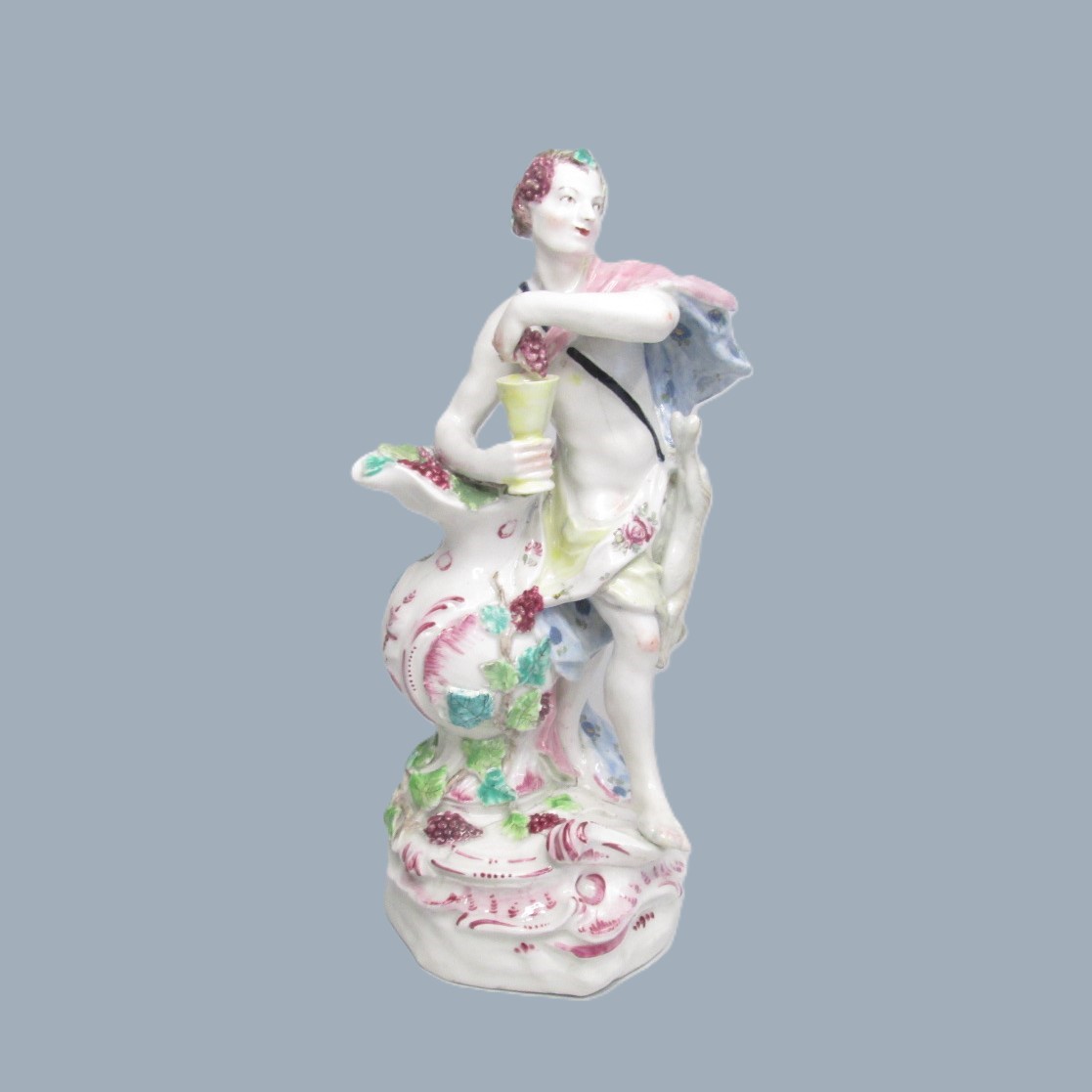 A porcelain figure of Bacchus Circa 1755, manufactured at the Bow factory, London, England, modelled standing beside a large ewer with his right arm resting on top of it holding a glass.