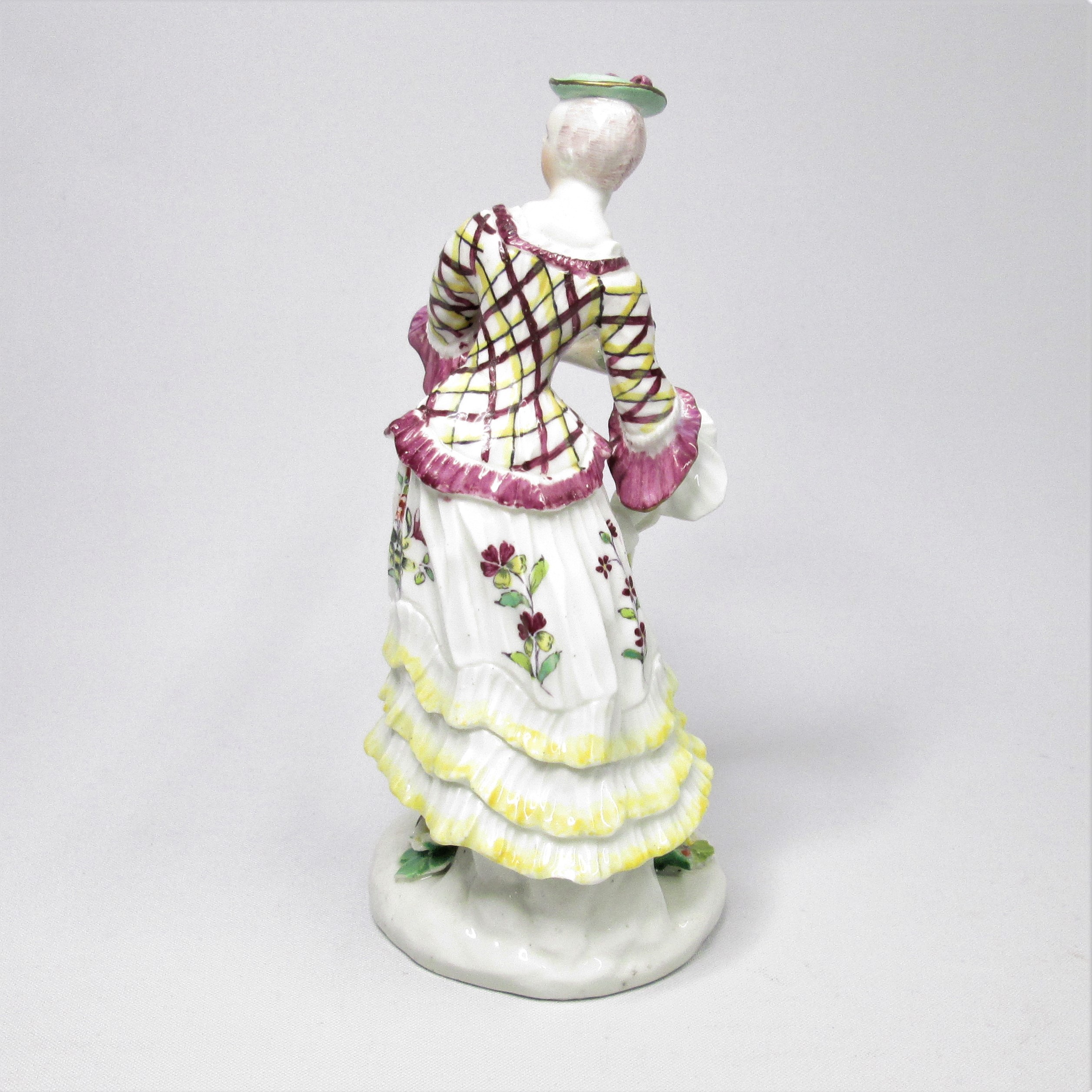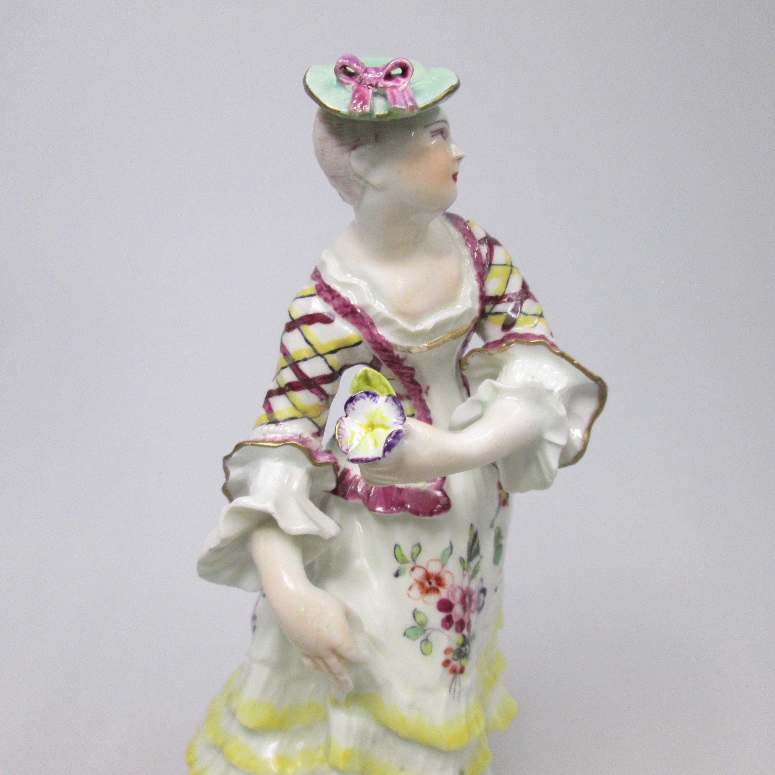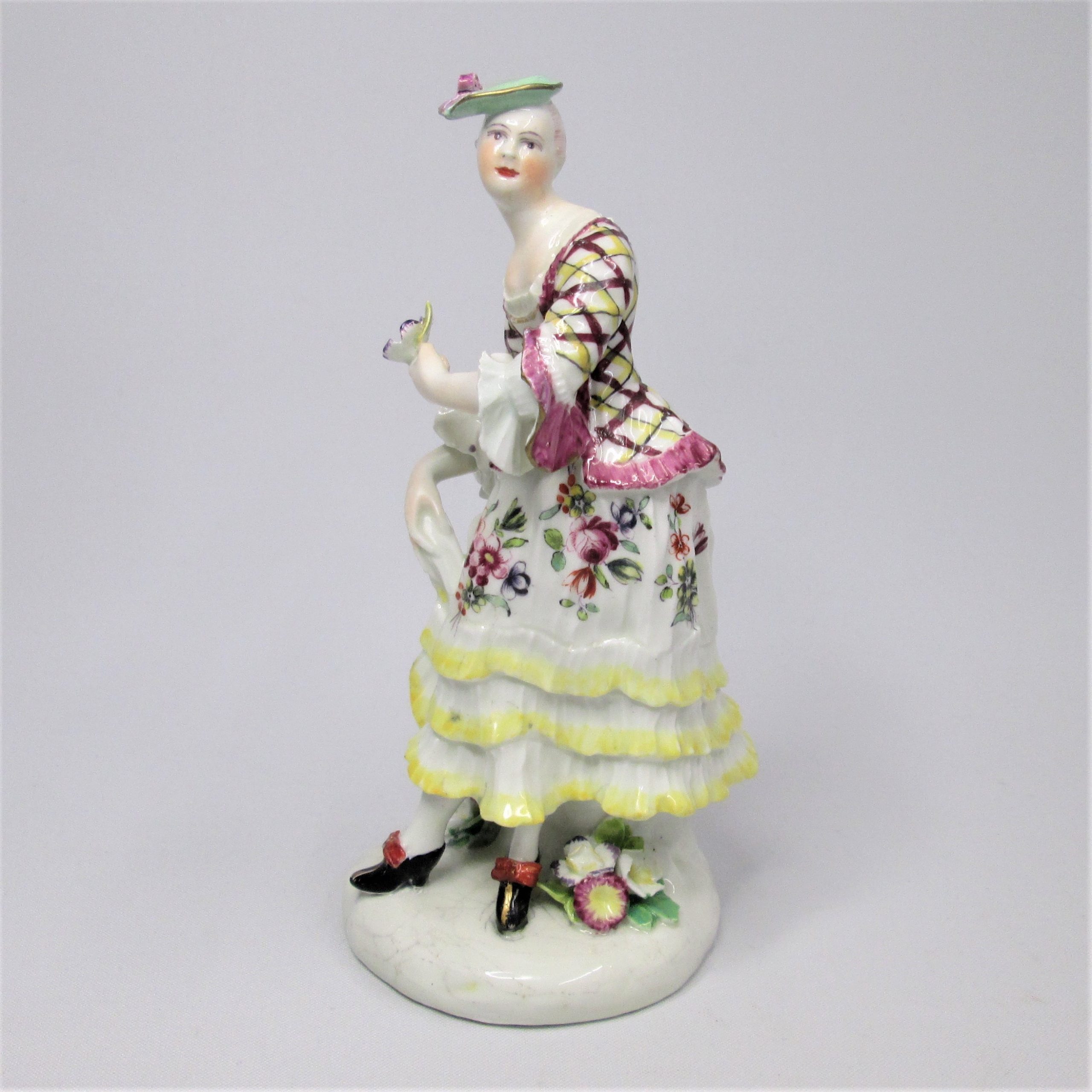 A Derby seated musician playing a flute hand decorated with a turquoise jacket and floral waistcoat and trousers. Circa 1756