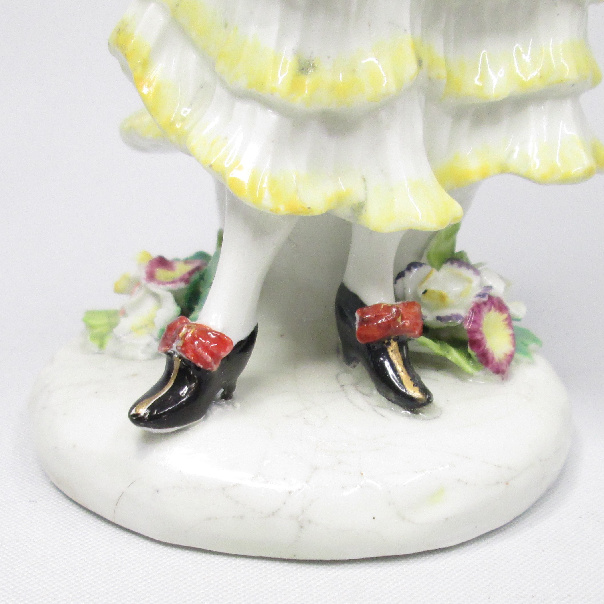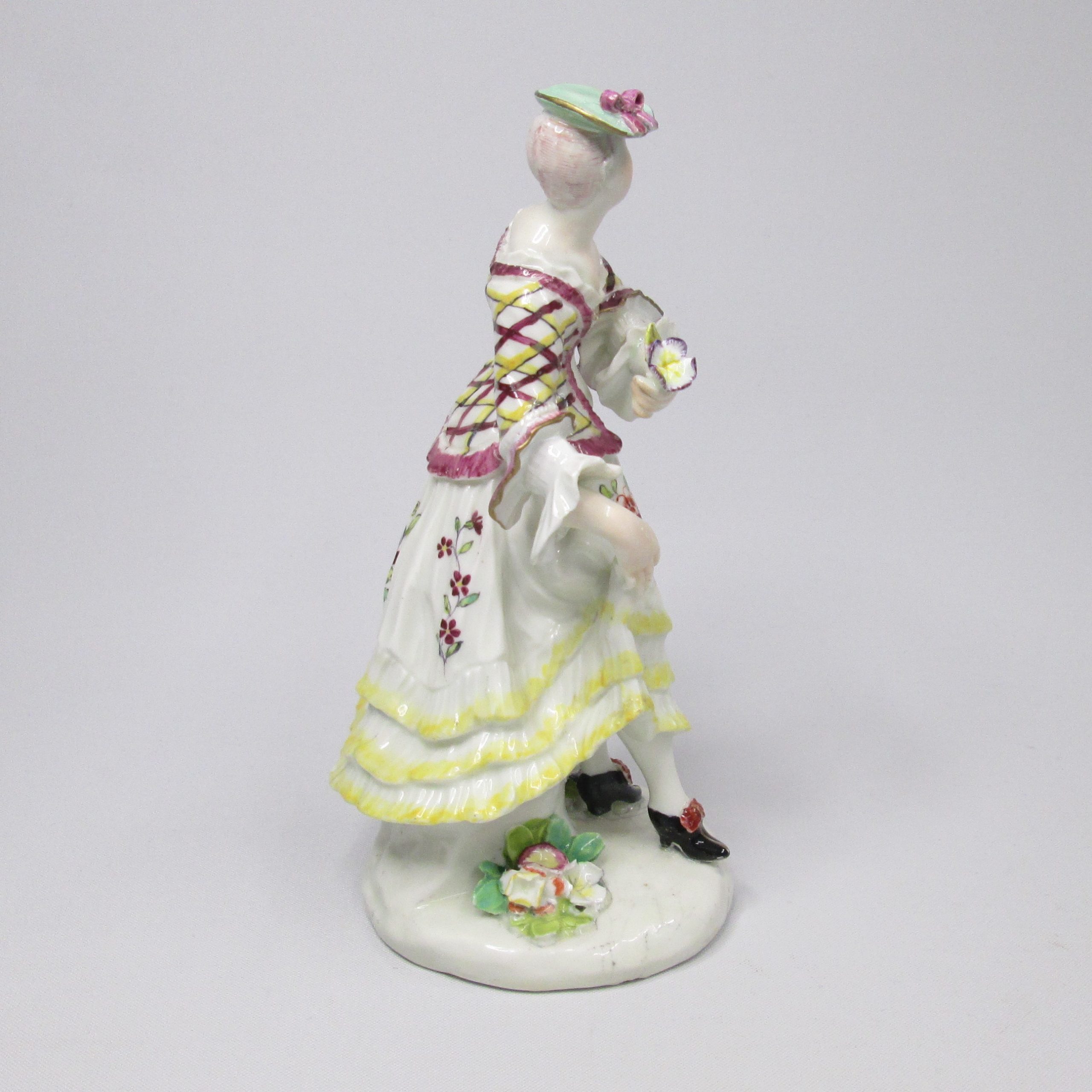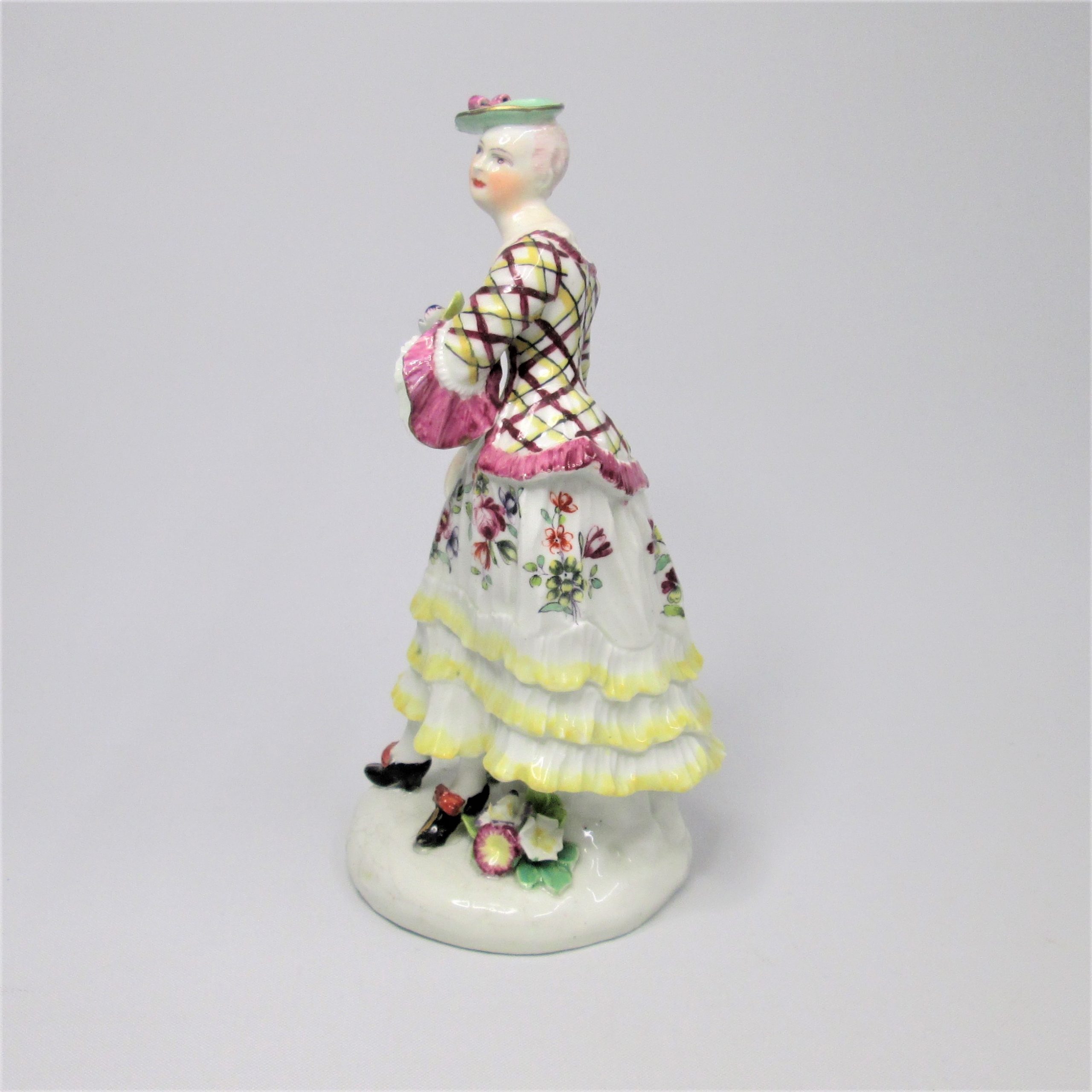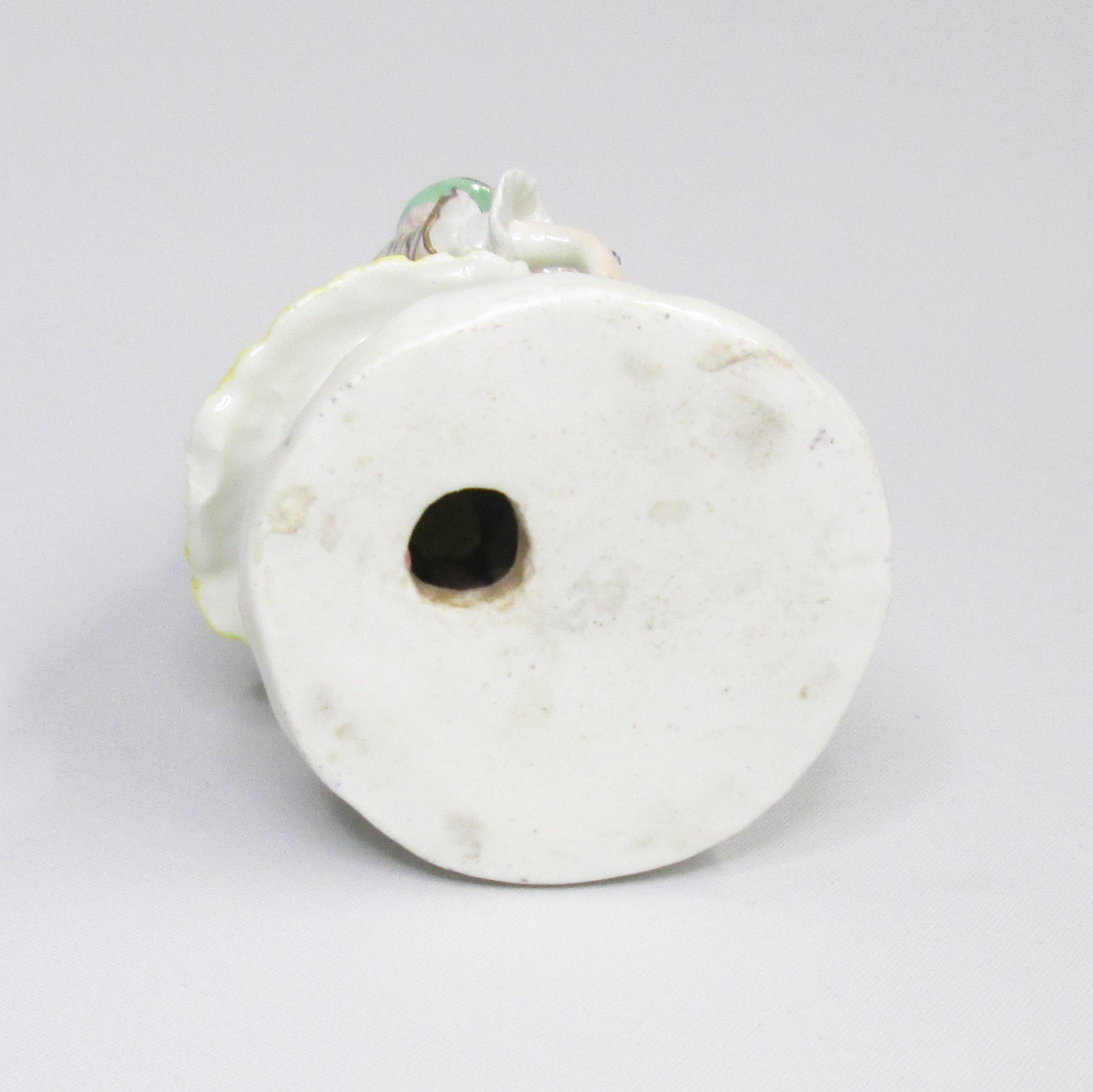 A Derby seated musician playing a flute hand decorated with a turquoise jacket and floral waistcoat and trousers. Circa 1756