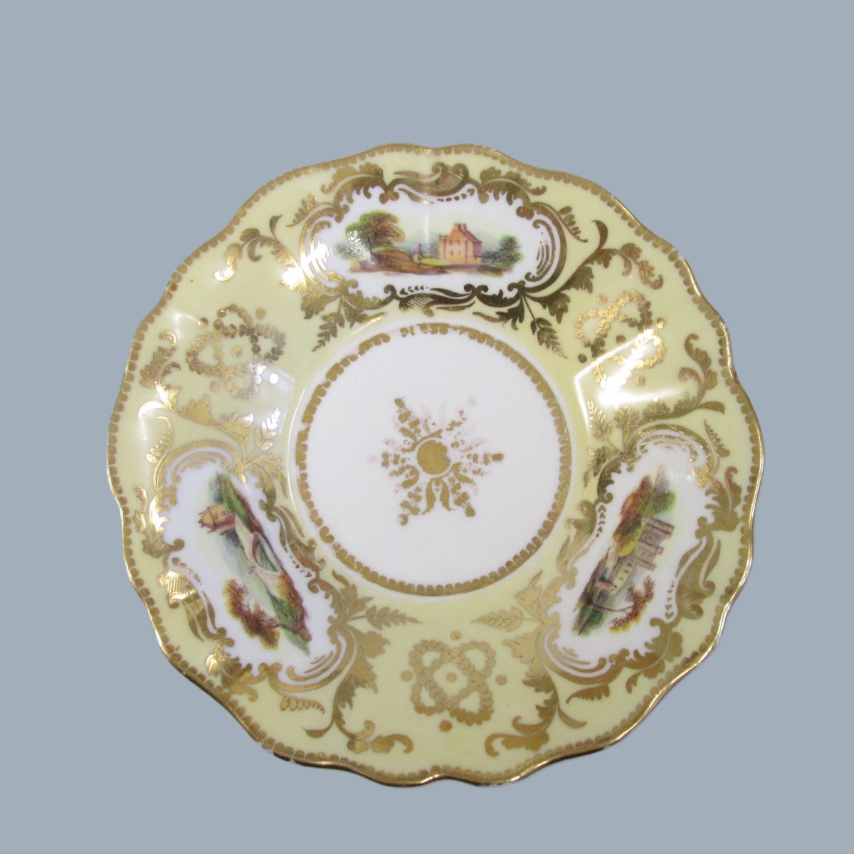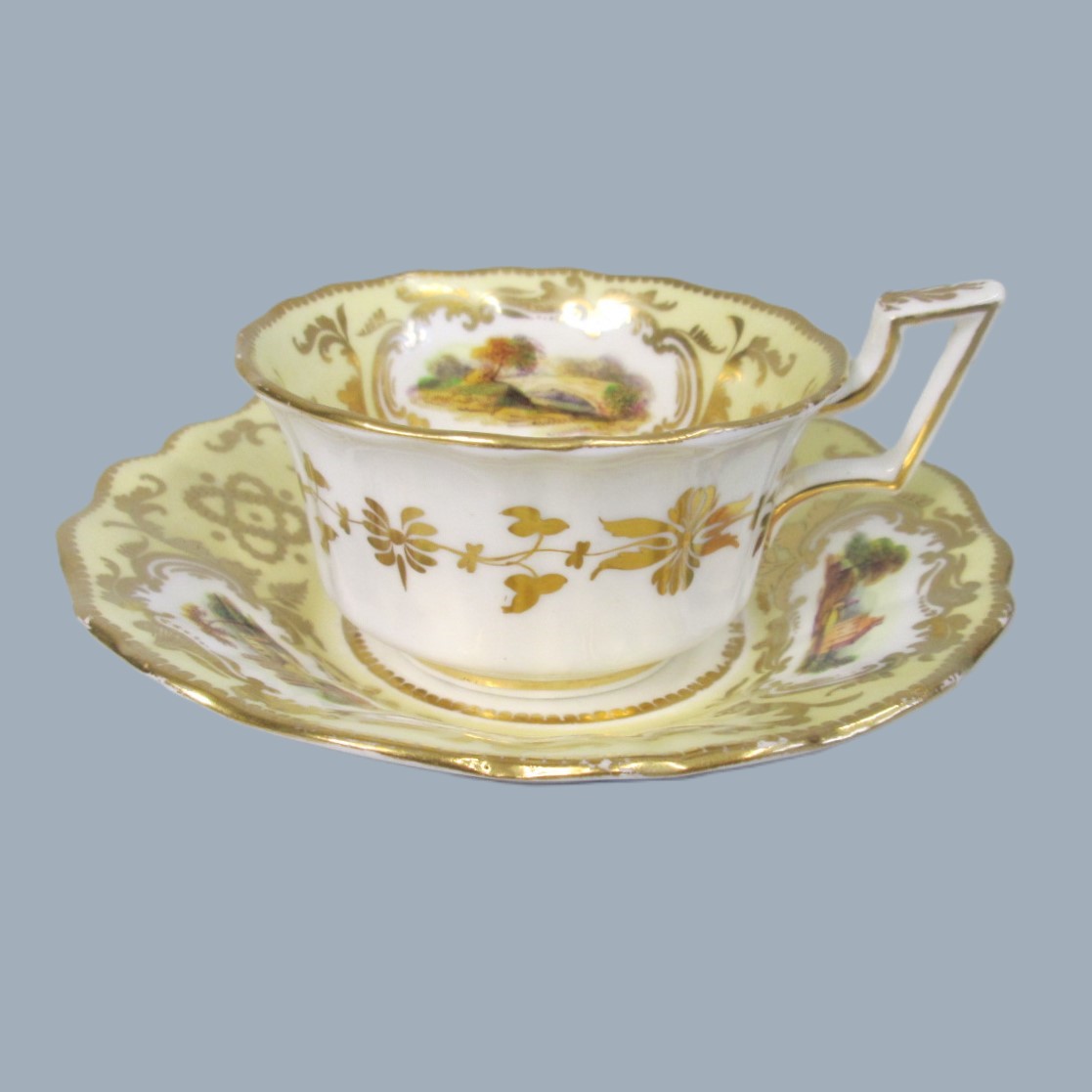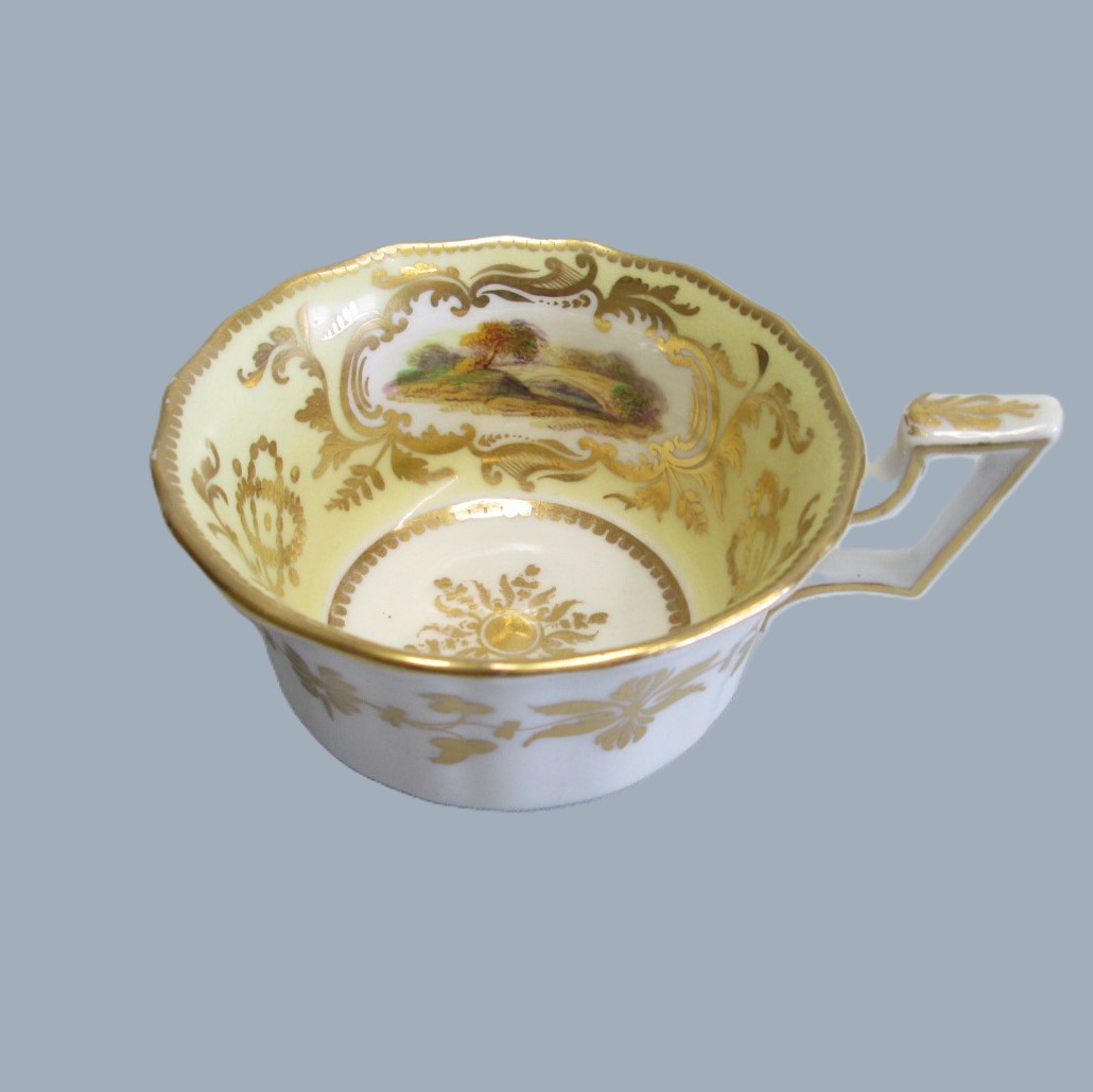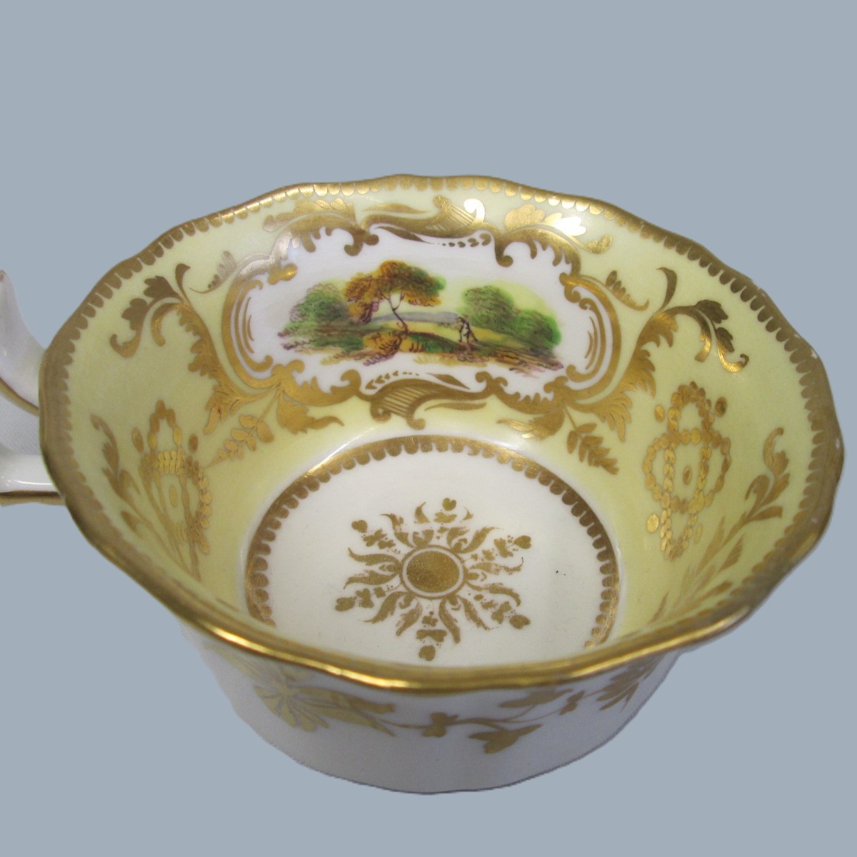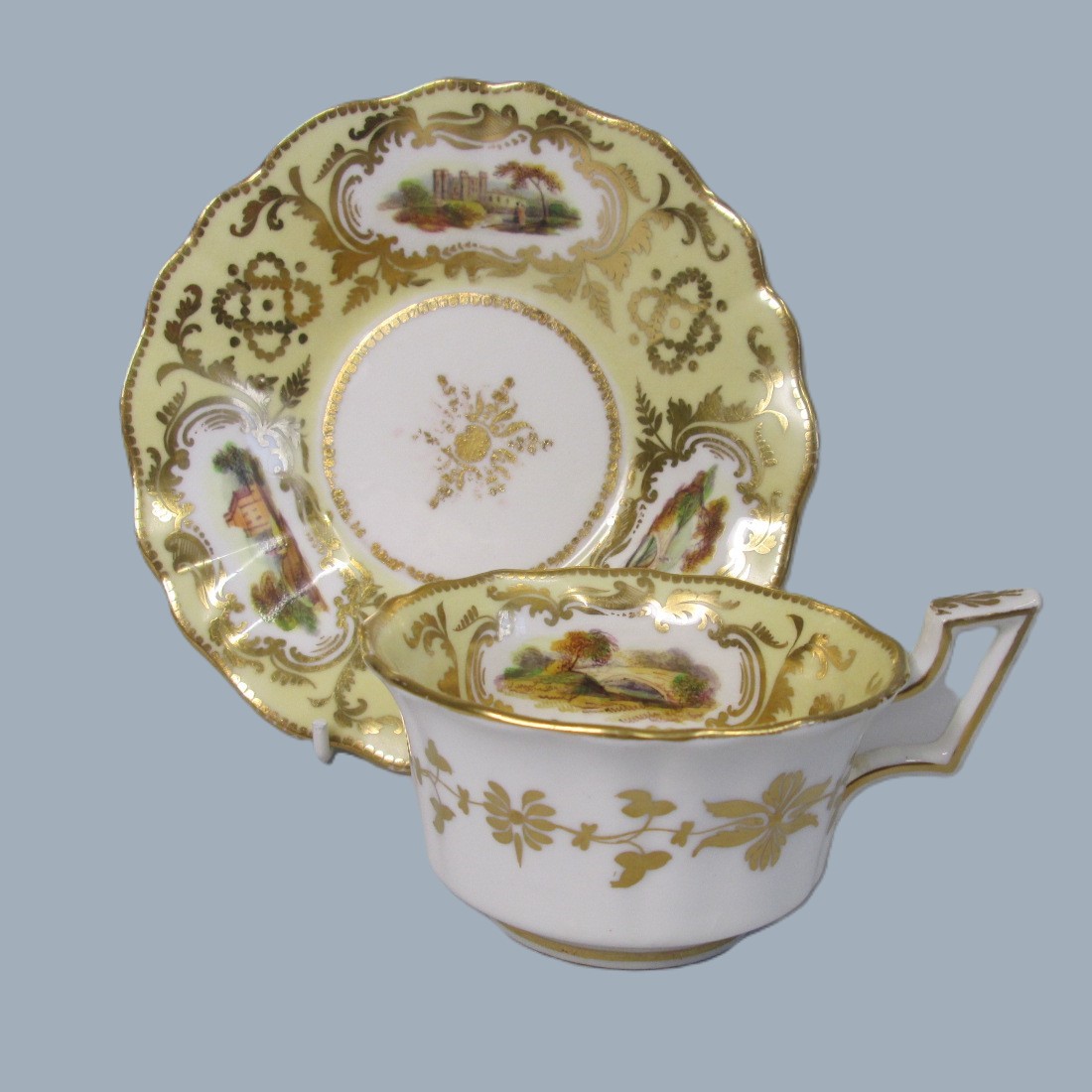 A Coalport porcelain rare yellow ground cup and saucer with three hand decorated English landscapes within shaped cartouches. Circa 1825