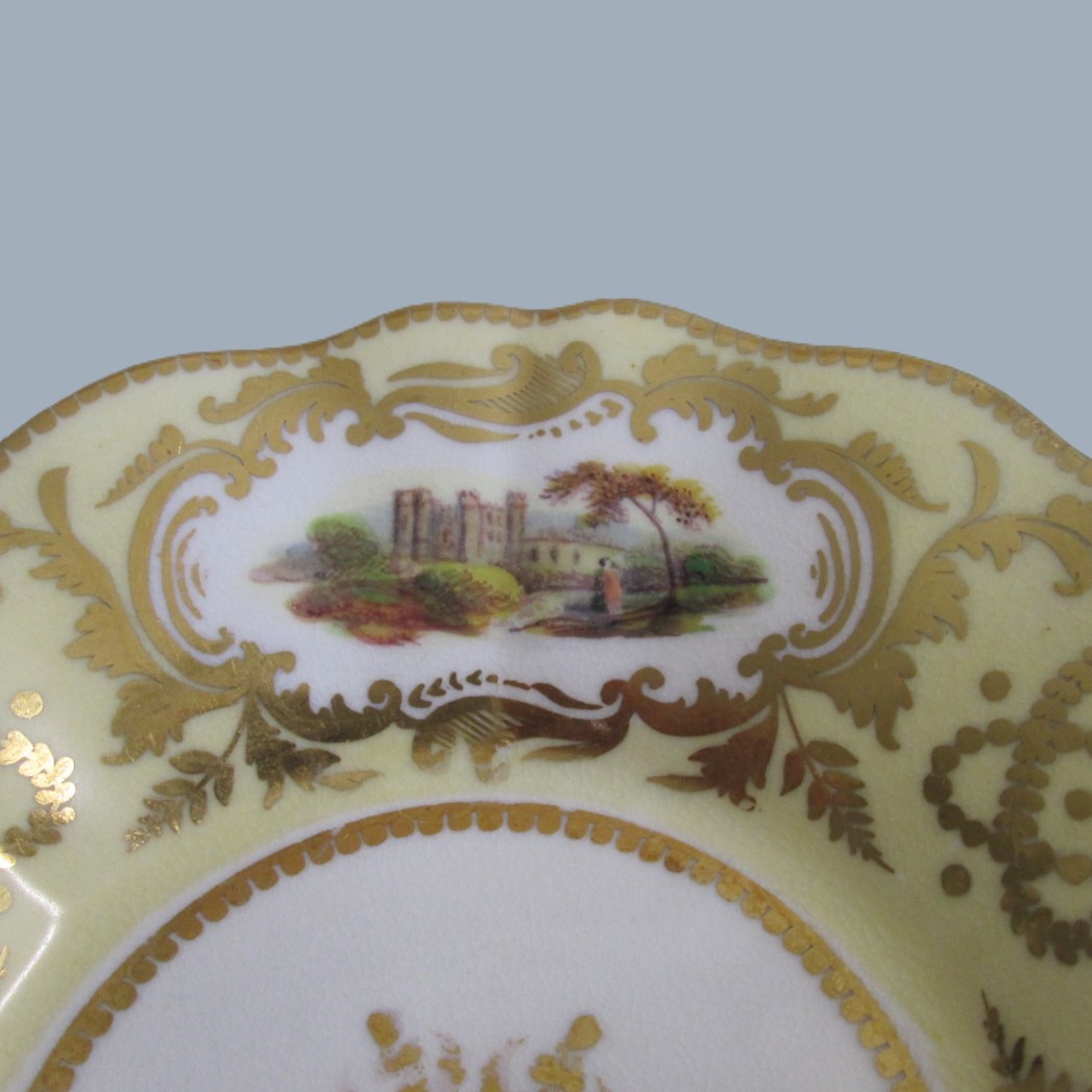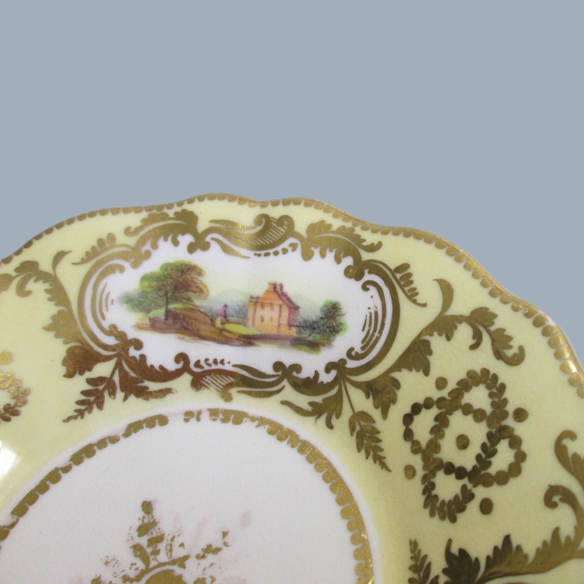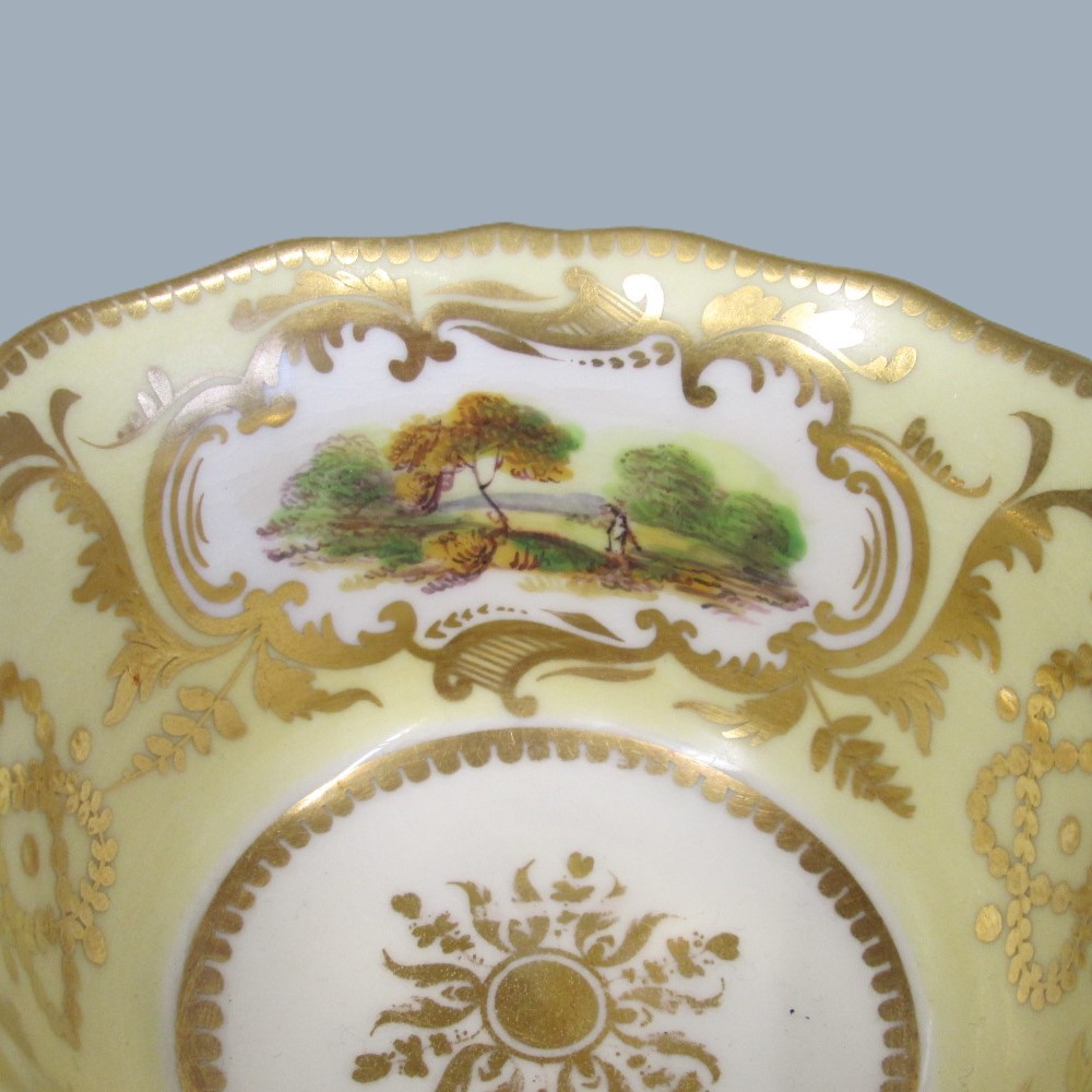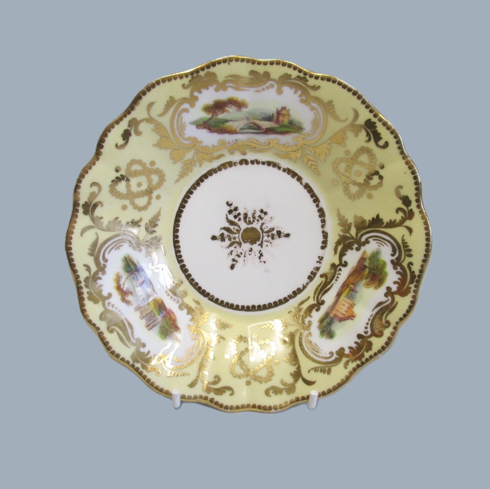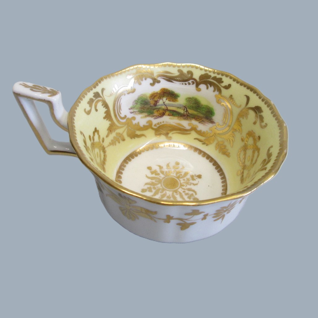 A Coalport porcelain rare yellow ground cup and saucer with three hand decorated English landscapes within shaped cartouches. Circa 1825