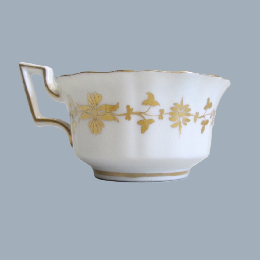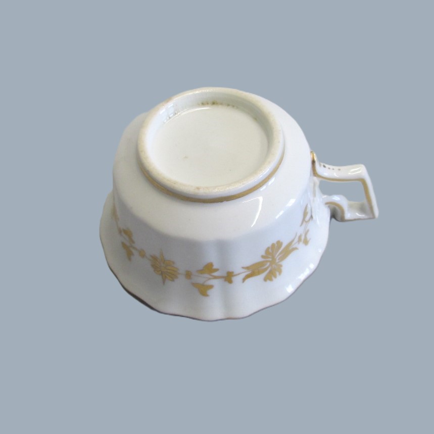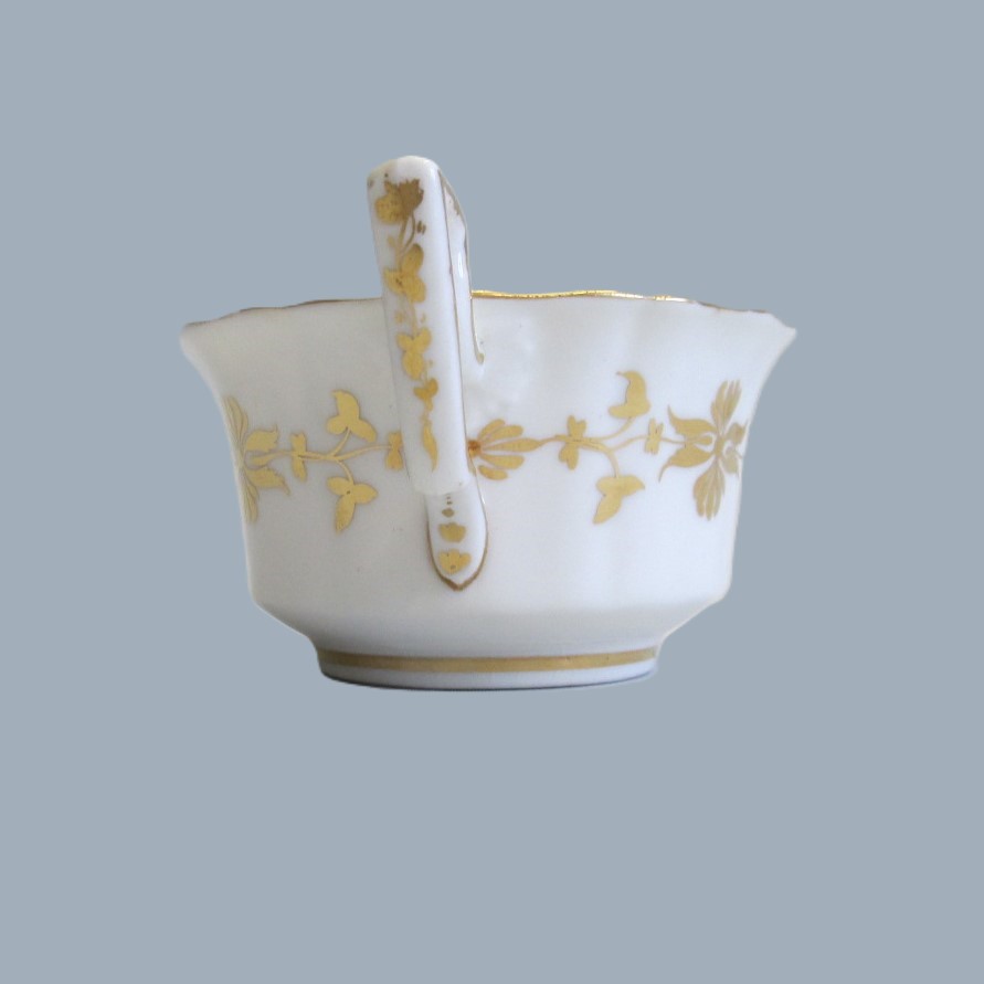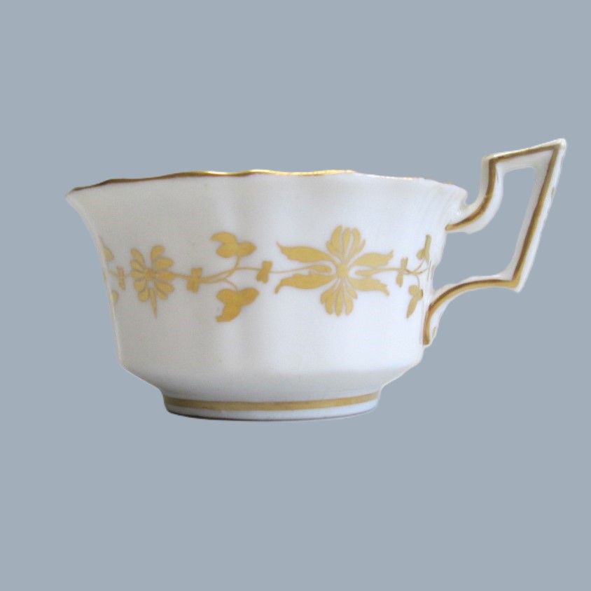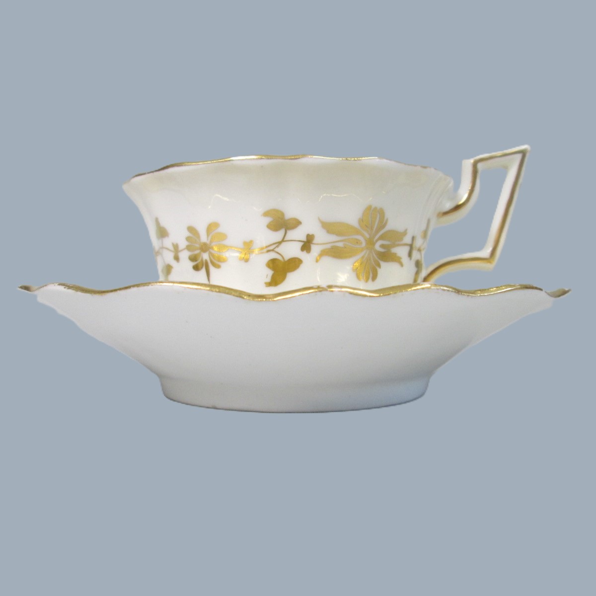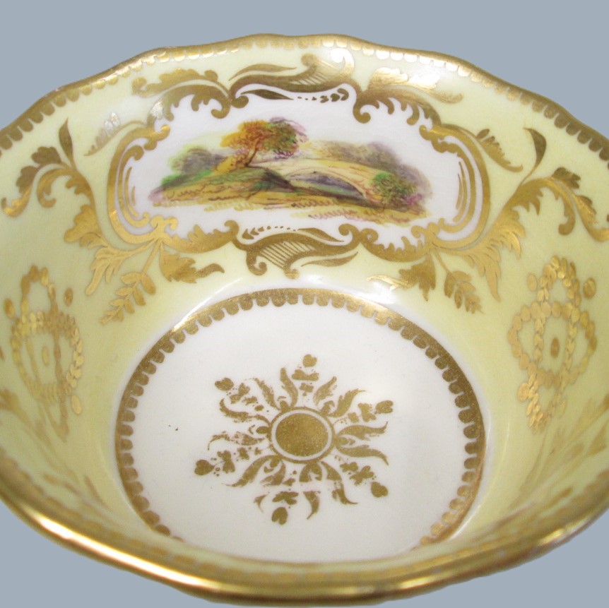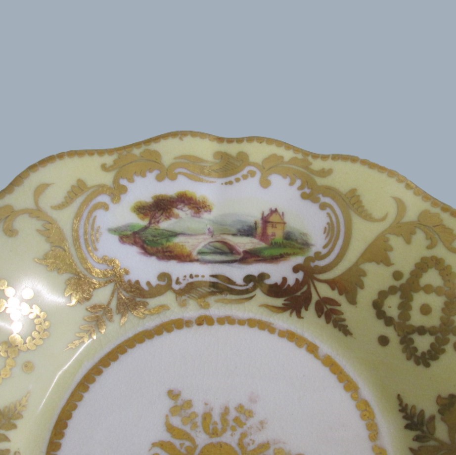 A Coalport porcelain rare yellow ground cup and saucer with three hand decorated English landscapes within shaped cartouches. Circa 1825