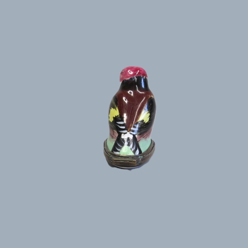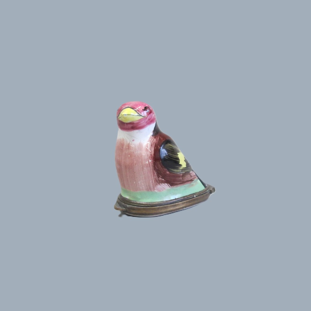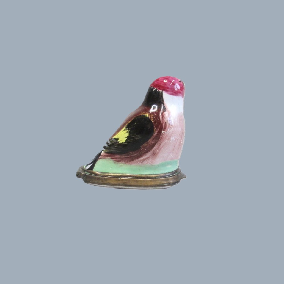 A delightful English South Staffordshire Bilston enamel hinged decorative bonbonniere box in the form of small Goldfinch bird.