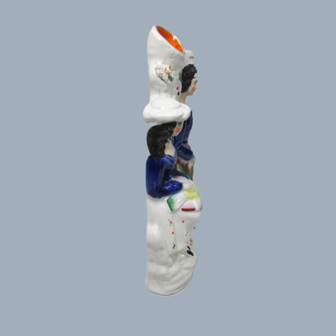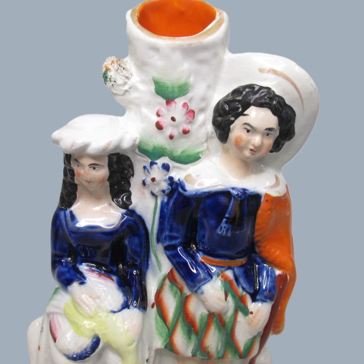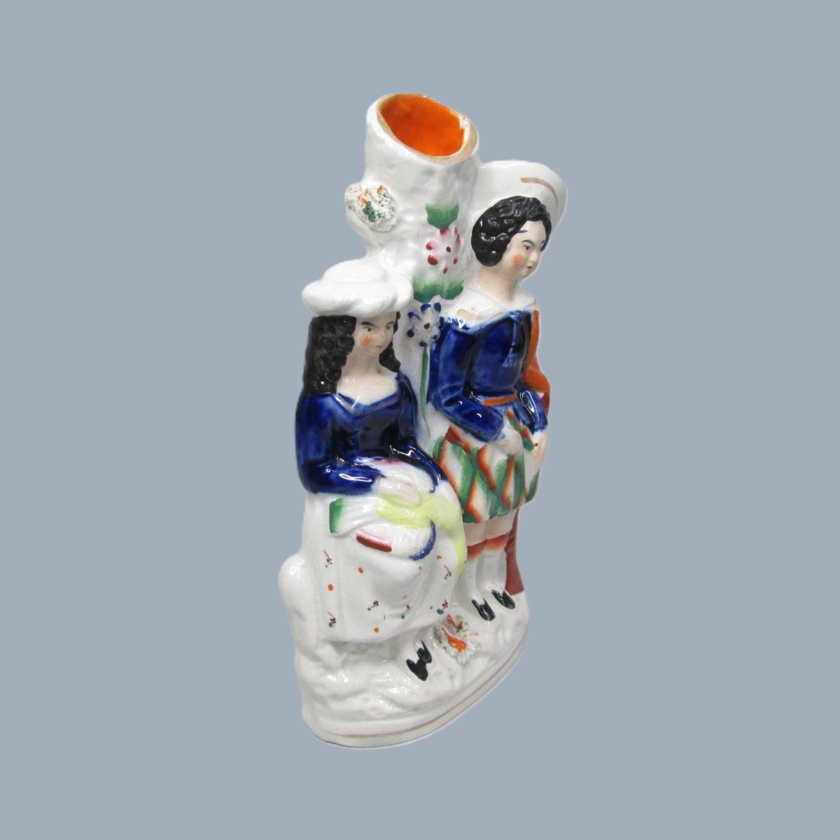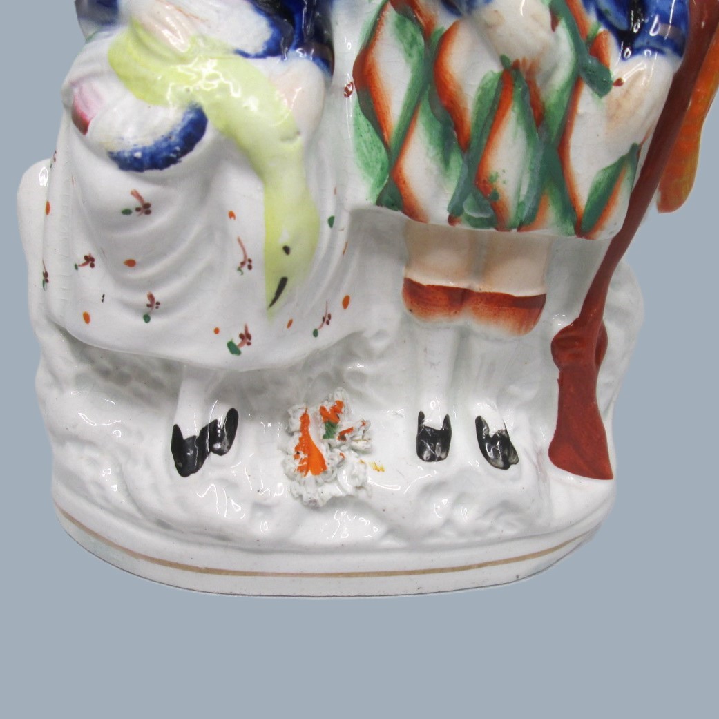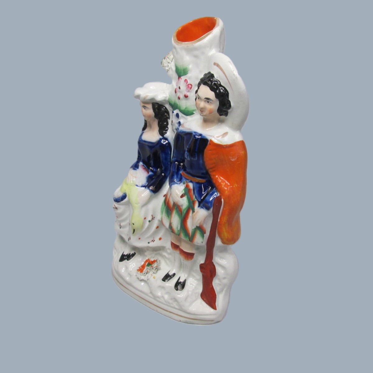 A Staffordshire spill holder group figure of a hunter and companion, he is wearing a hat, tunic and kilt and his rifle is standing at his left side, she is seated wearing a hat, bodice and long dress. She is holding a bird on her lap. Between them is a flowering plant.
