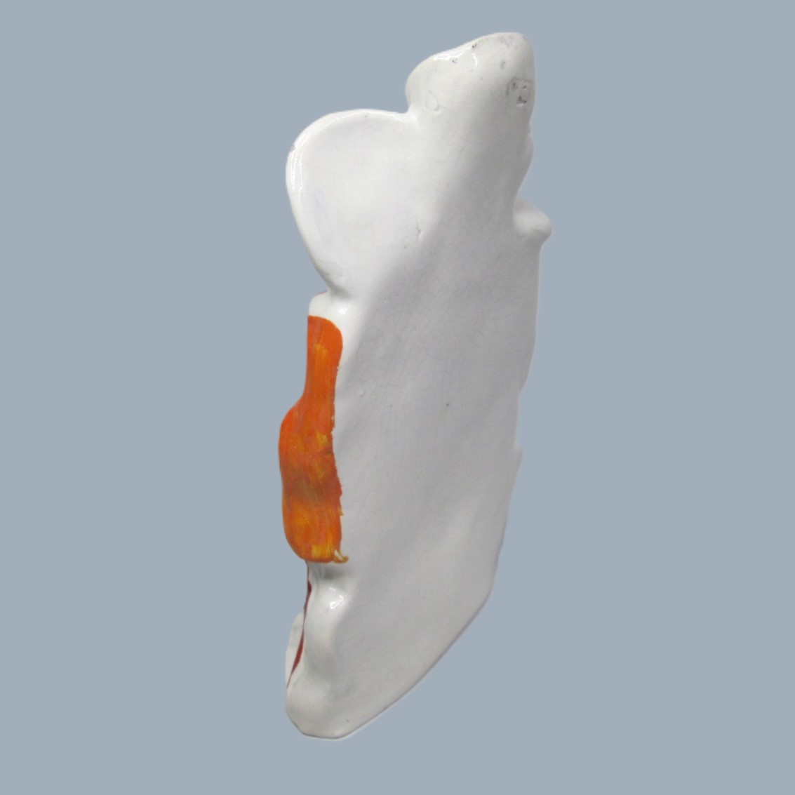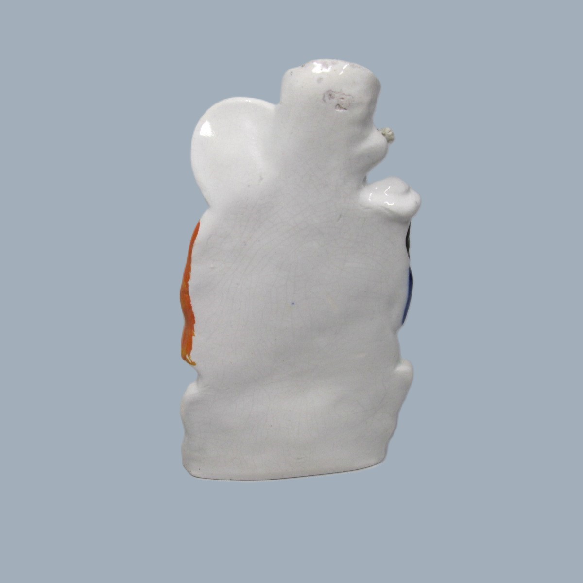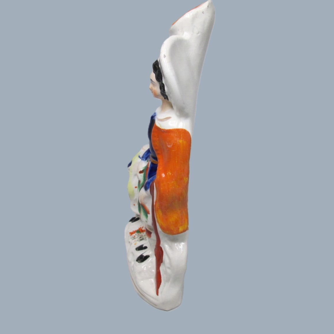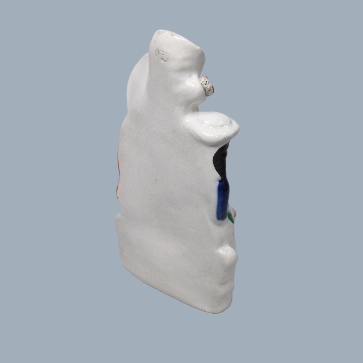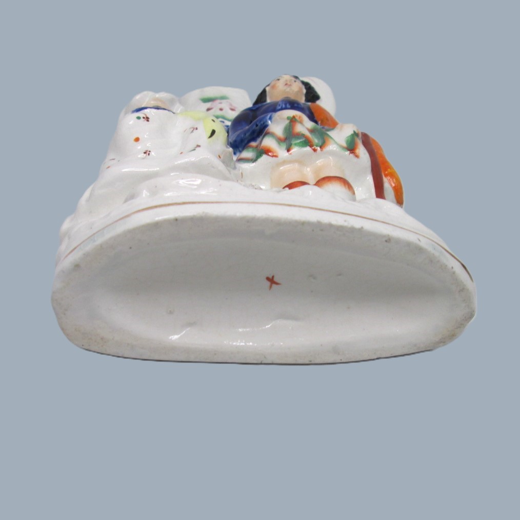 A Staffordshire spill holder group figure of a hunter and companion, he is wearing a hat, tunic and kilt and his rifle is standing at his left side, she is seated wearing a hat, bodice and long dress. She is holding a bird on her lap. Between them is a flowering plant.