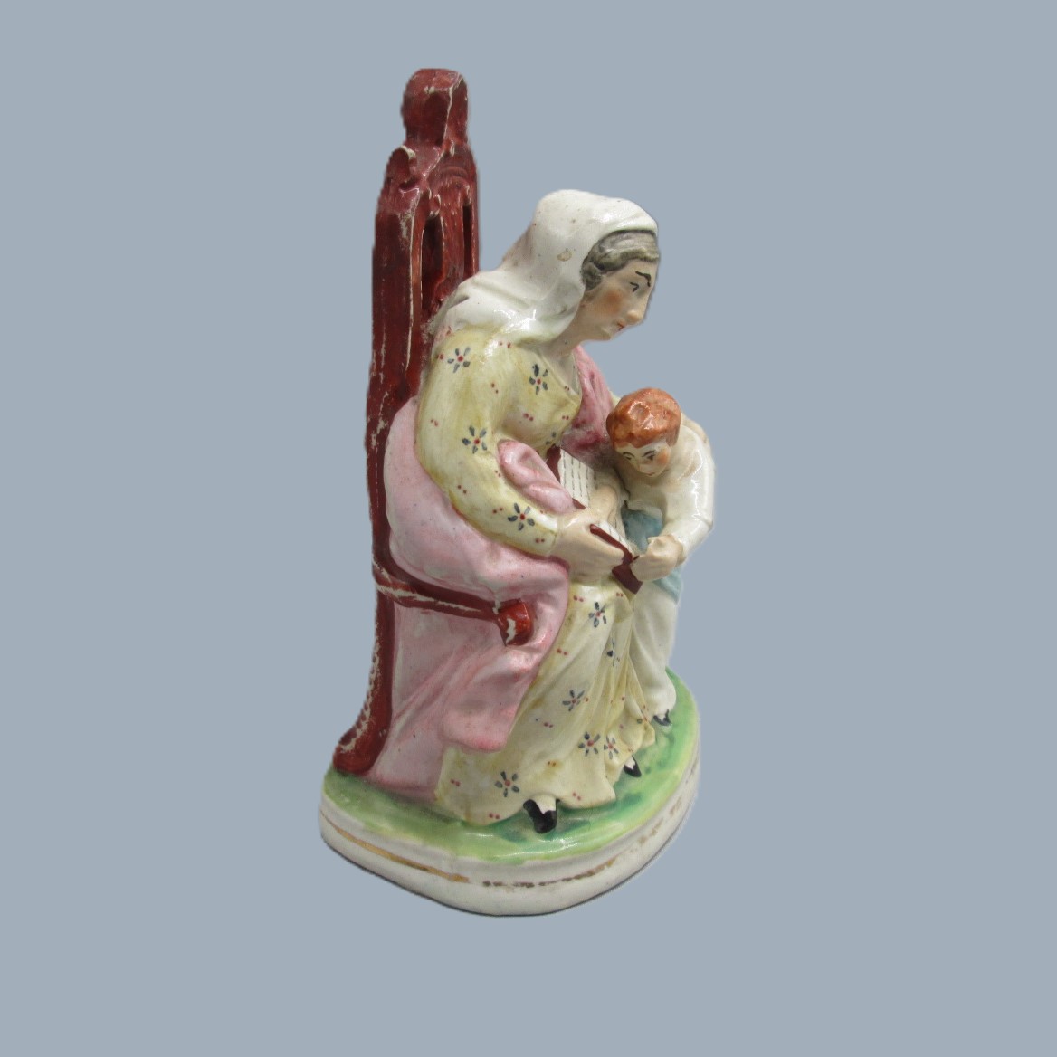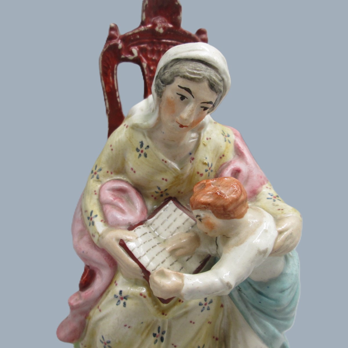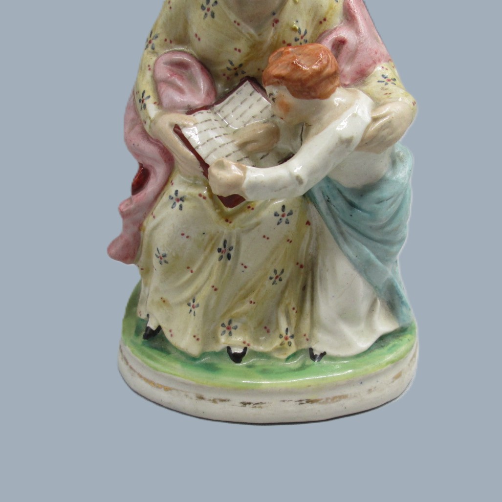 A Staffordshire figure of a seated woman reading from a book, with a small boy, copied from the Derby figure ‘The Prudent mother’.