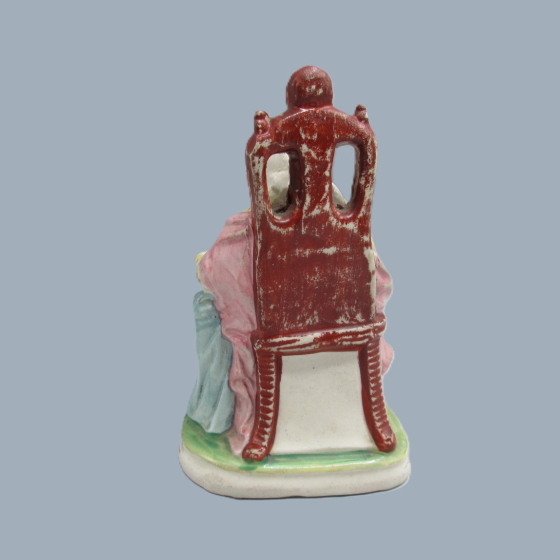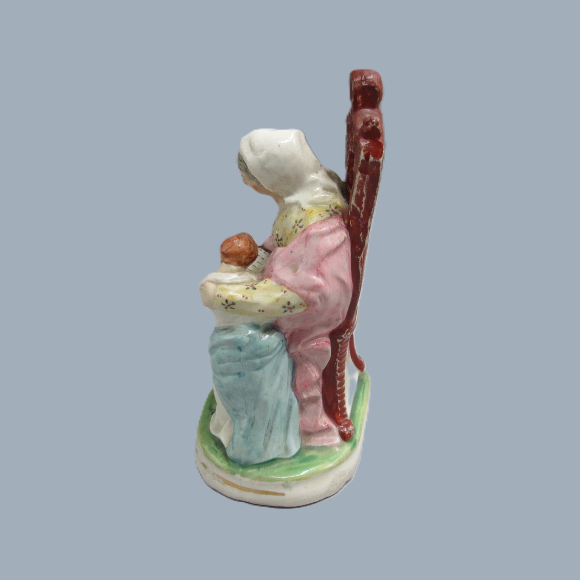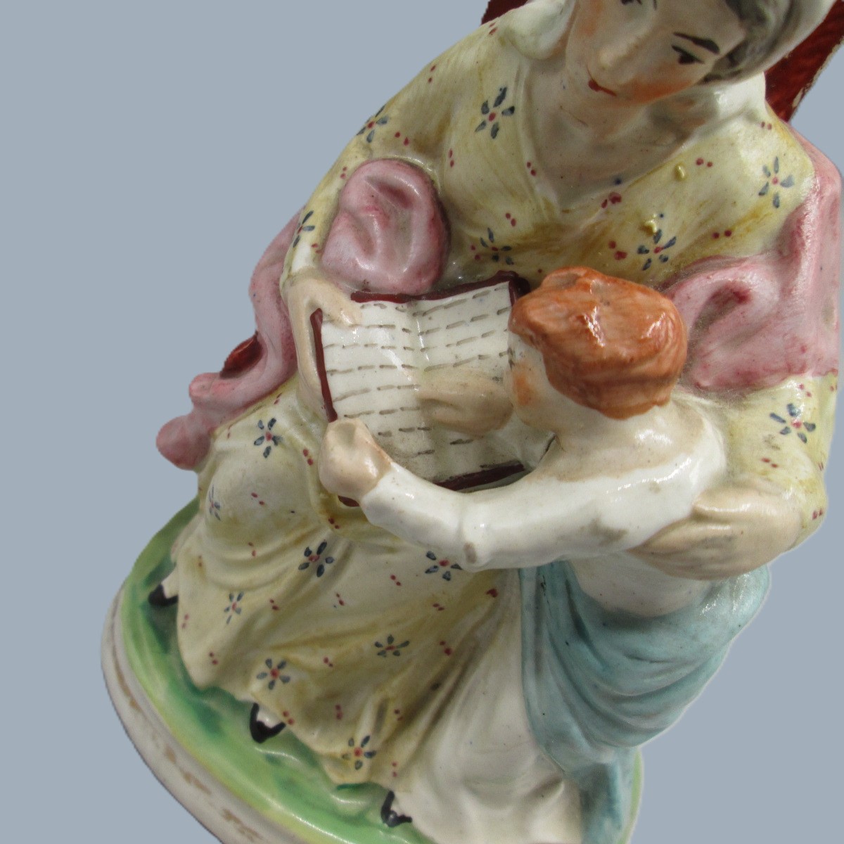 A Staffordshire figure of a seated woman reading from a book, with a small boy, copied from the Derby figure ‘The Prudent mother’.
