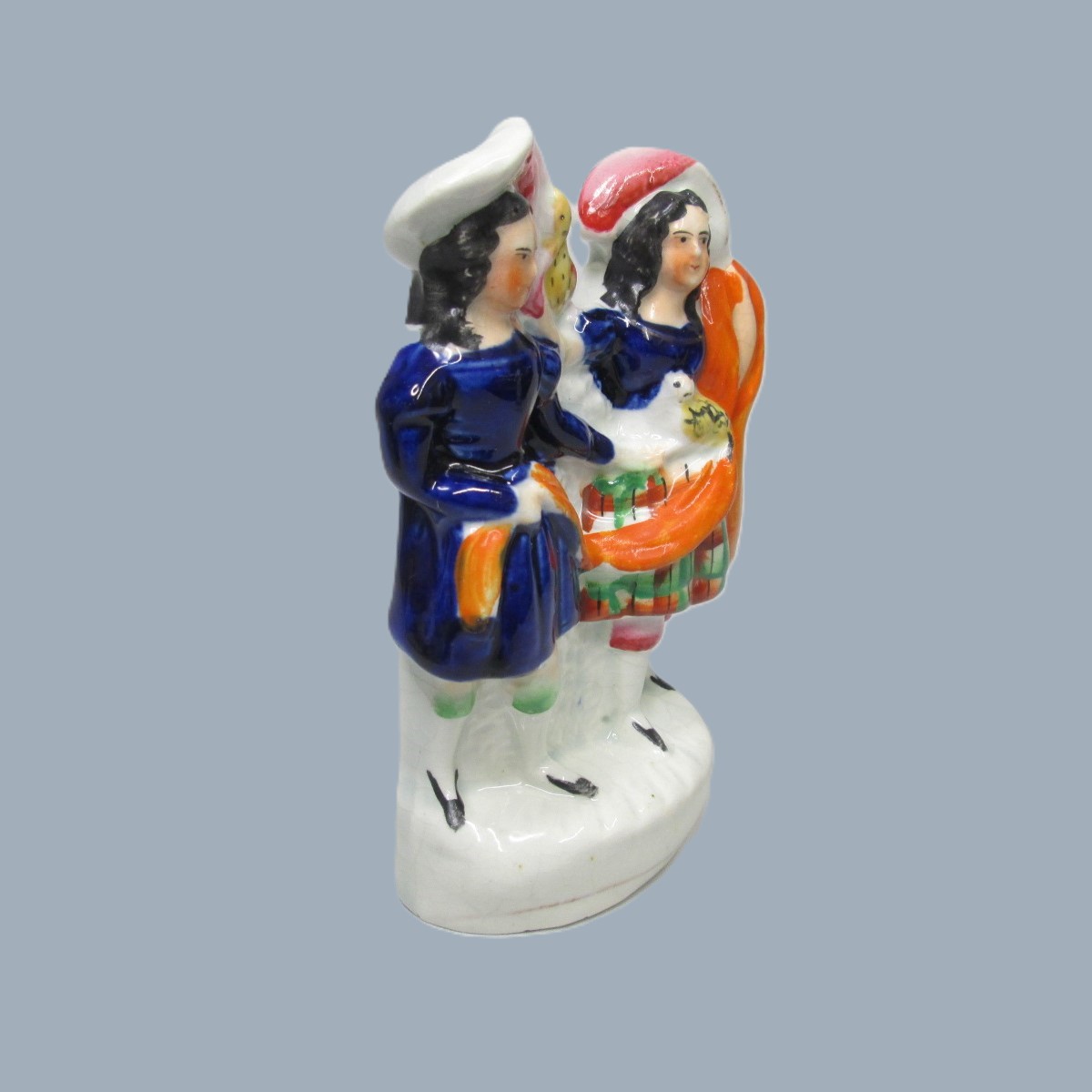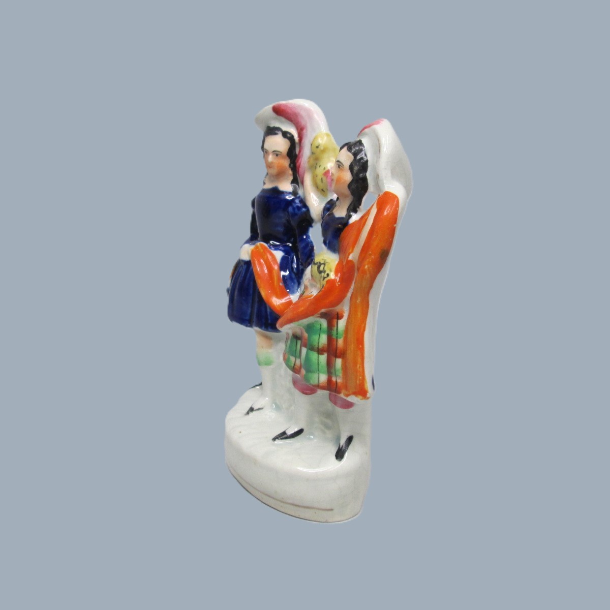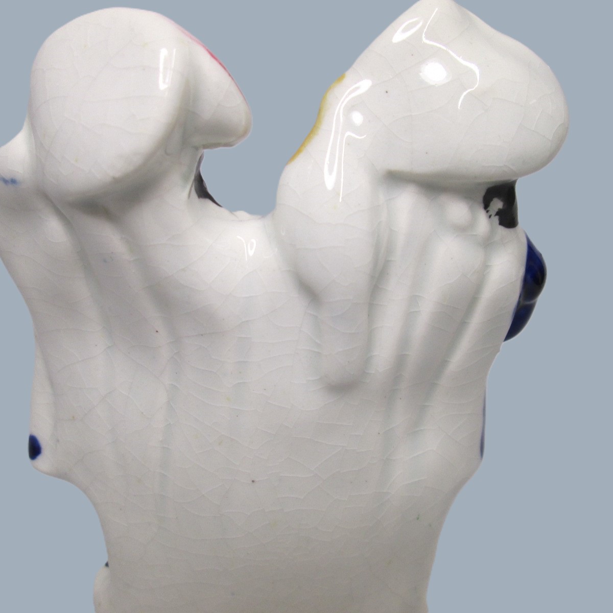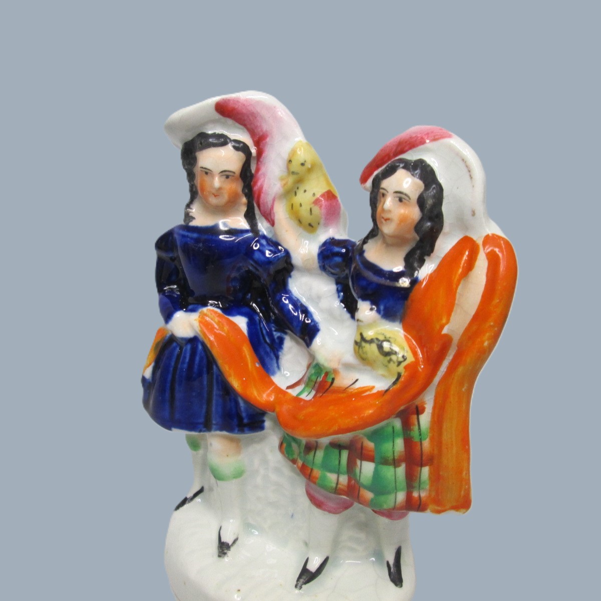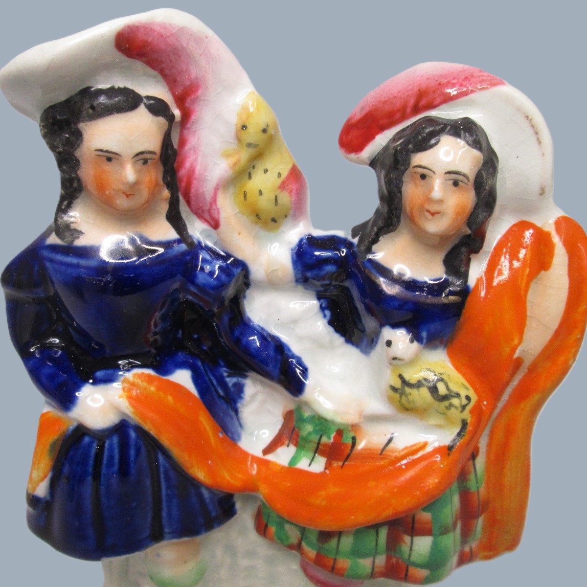 “A unusual Staffordshire group of two children with a parrot and a cat”