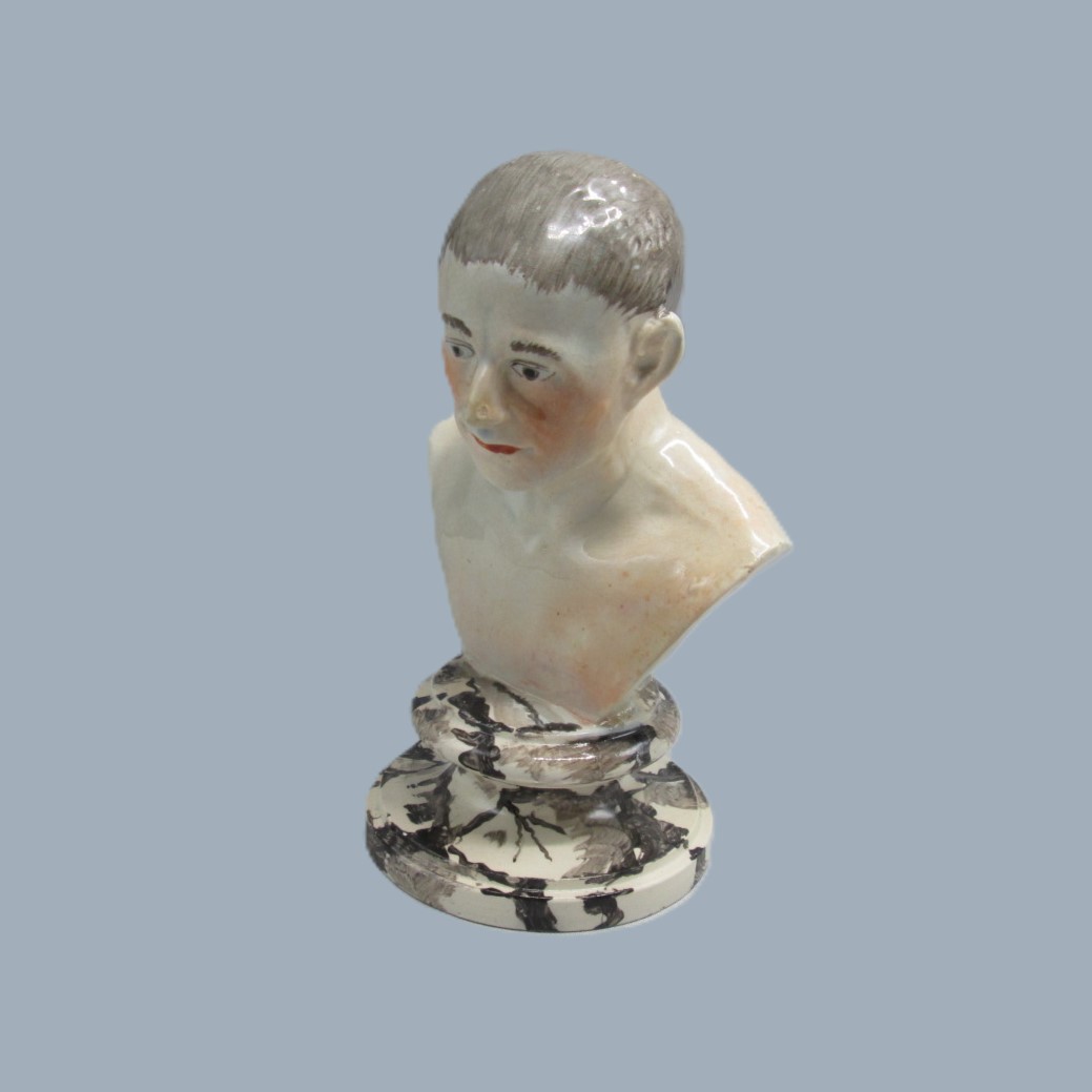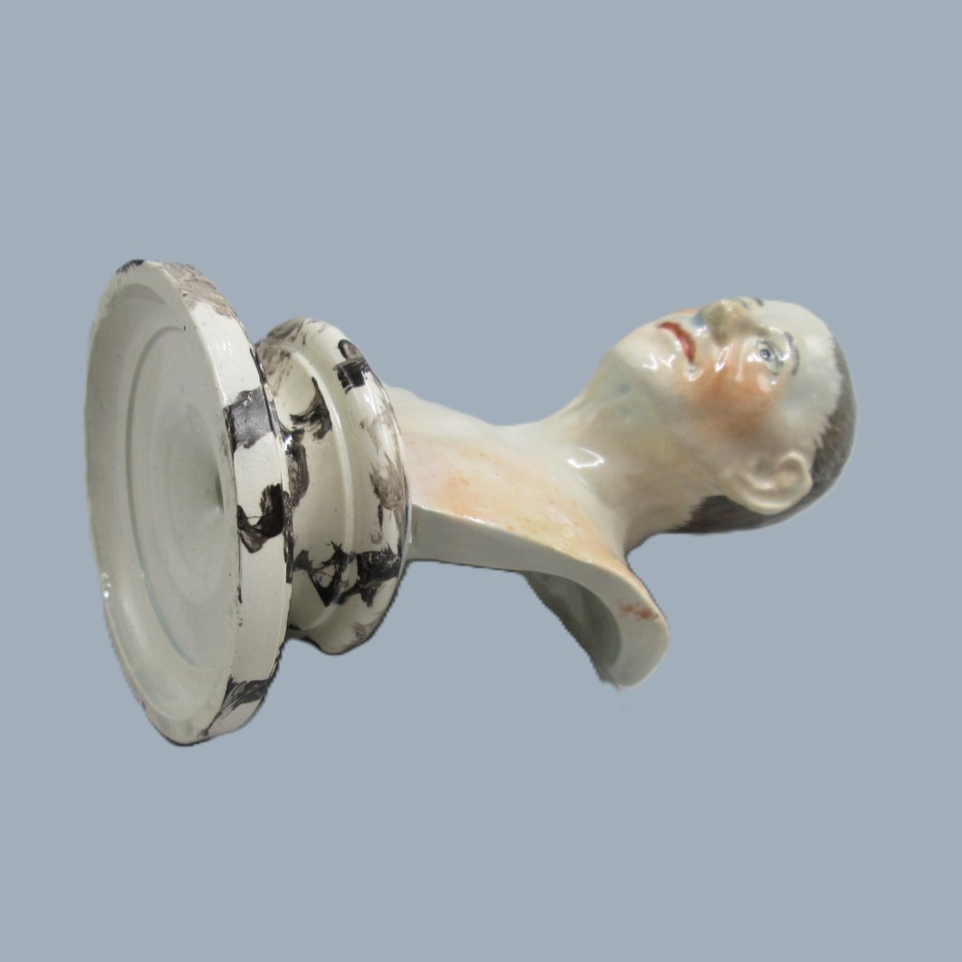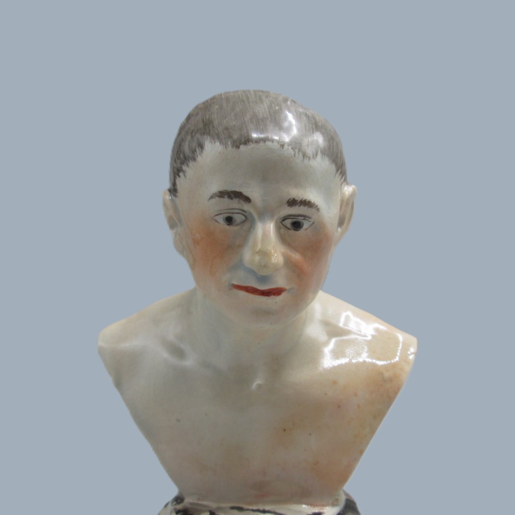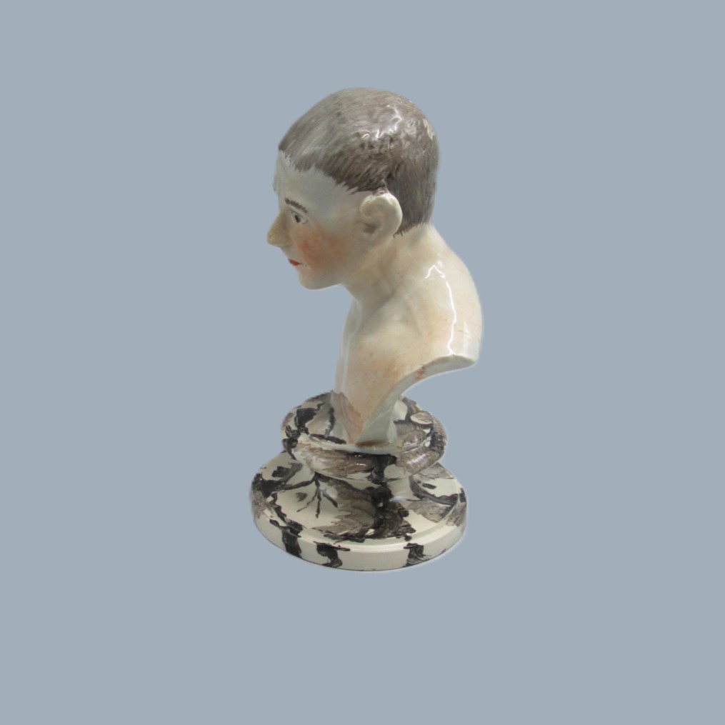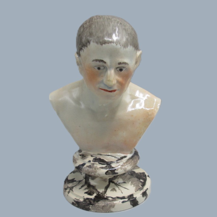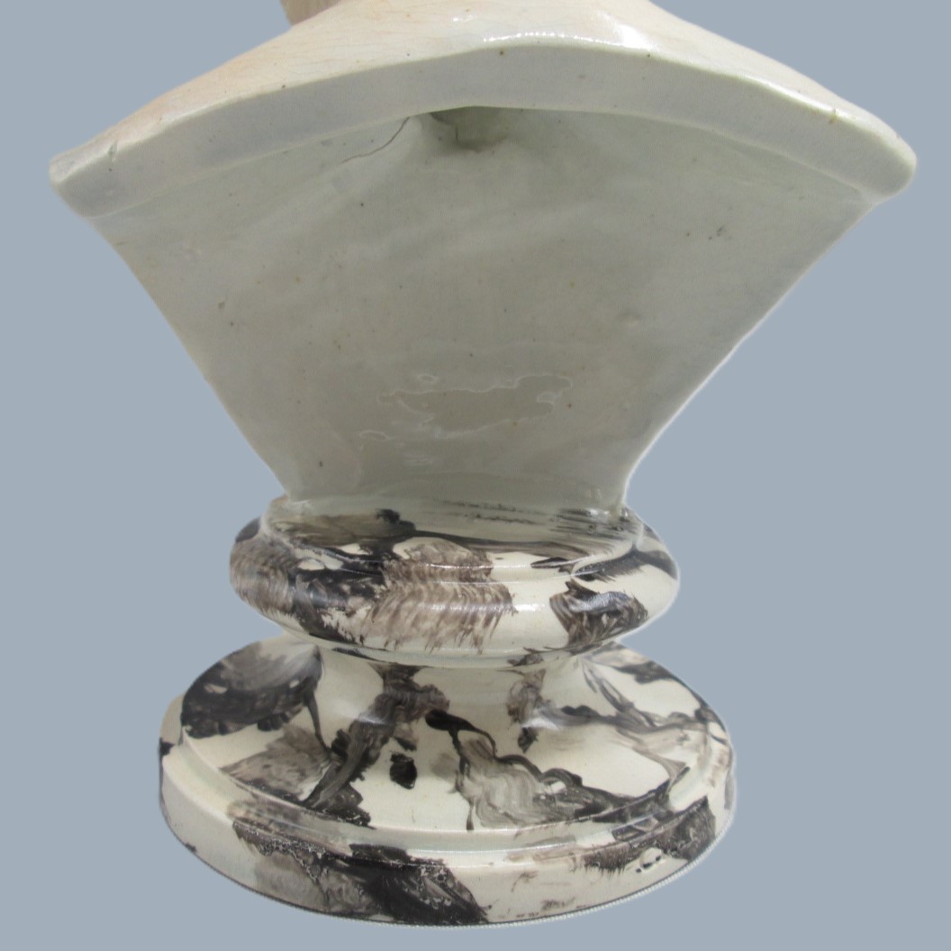 A Staffordshire small pottery bust of Seneca mounted on a marbleised soccle base. Circa; 19th Century