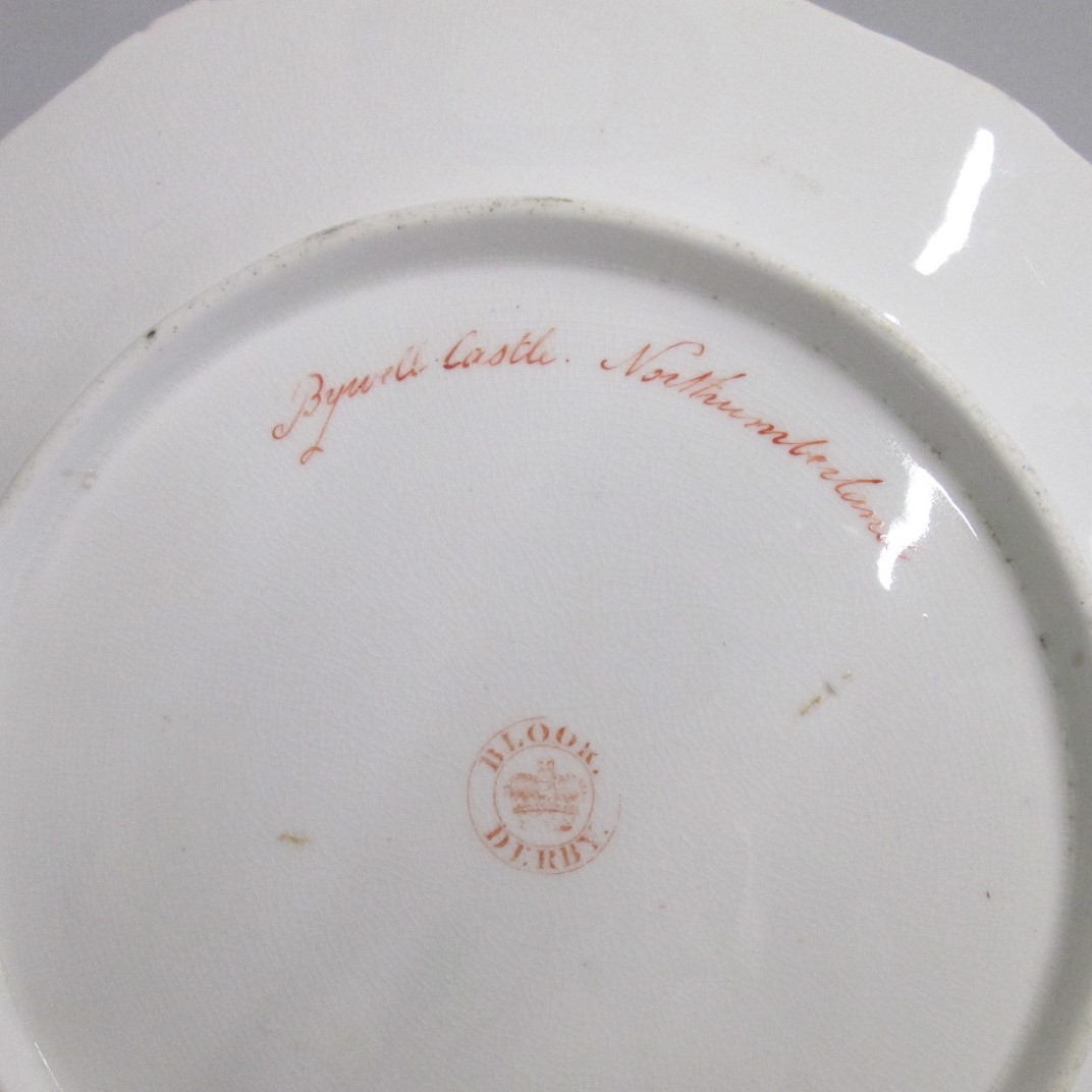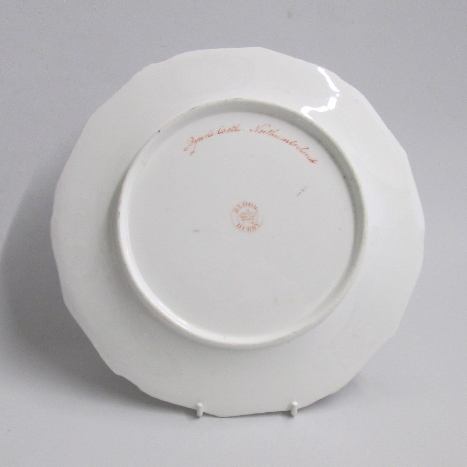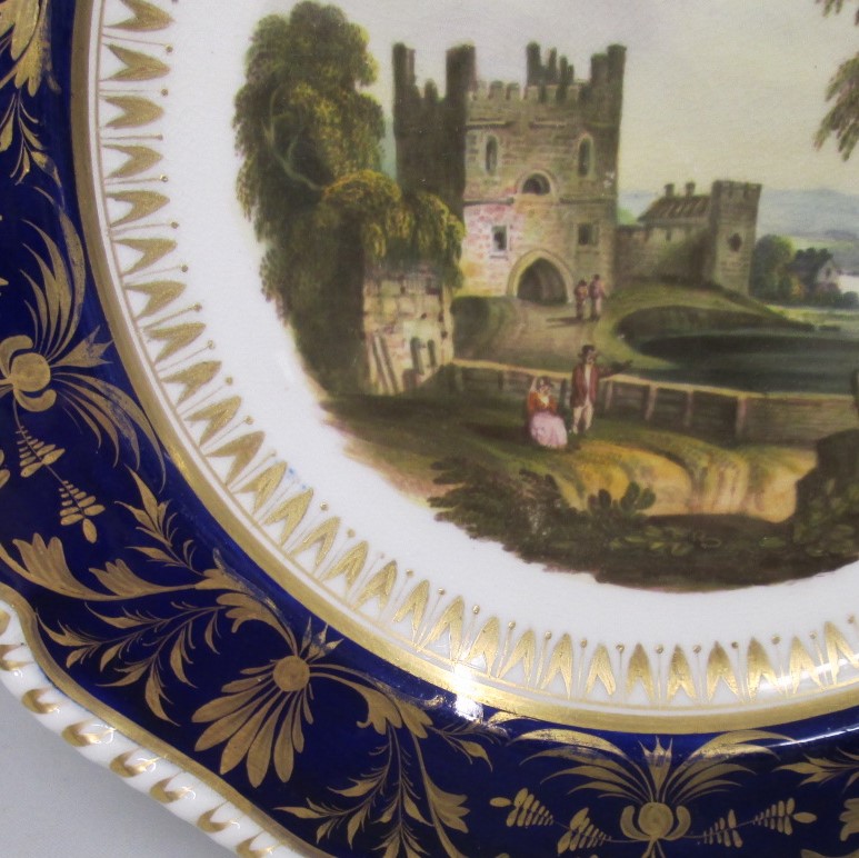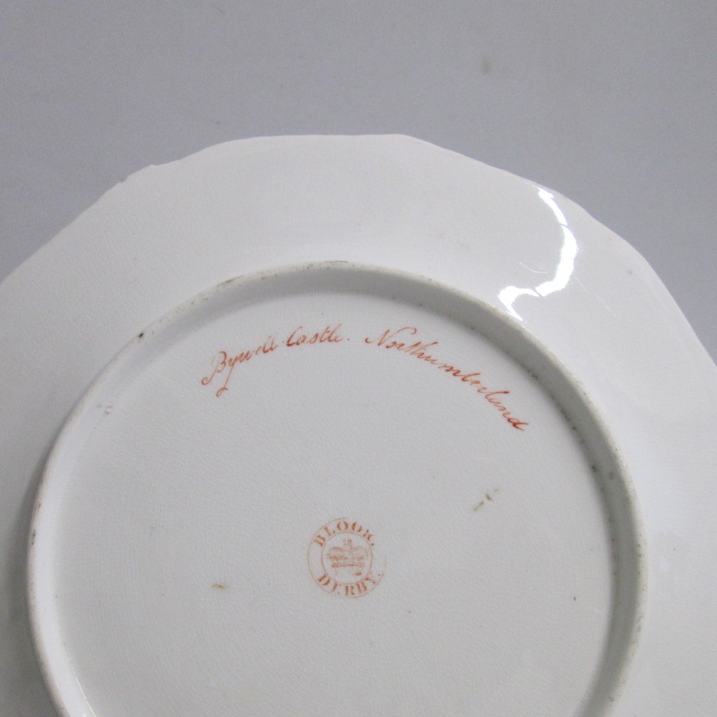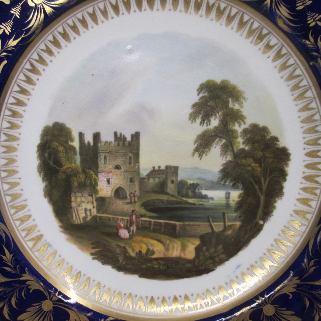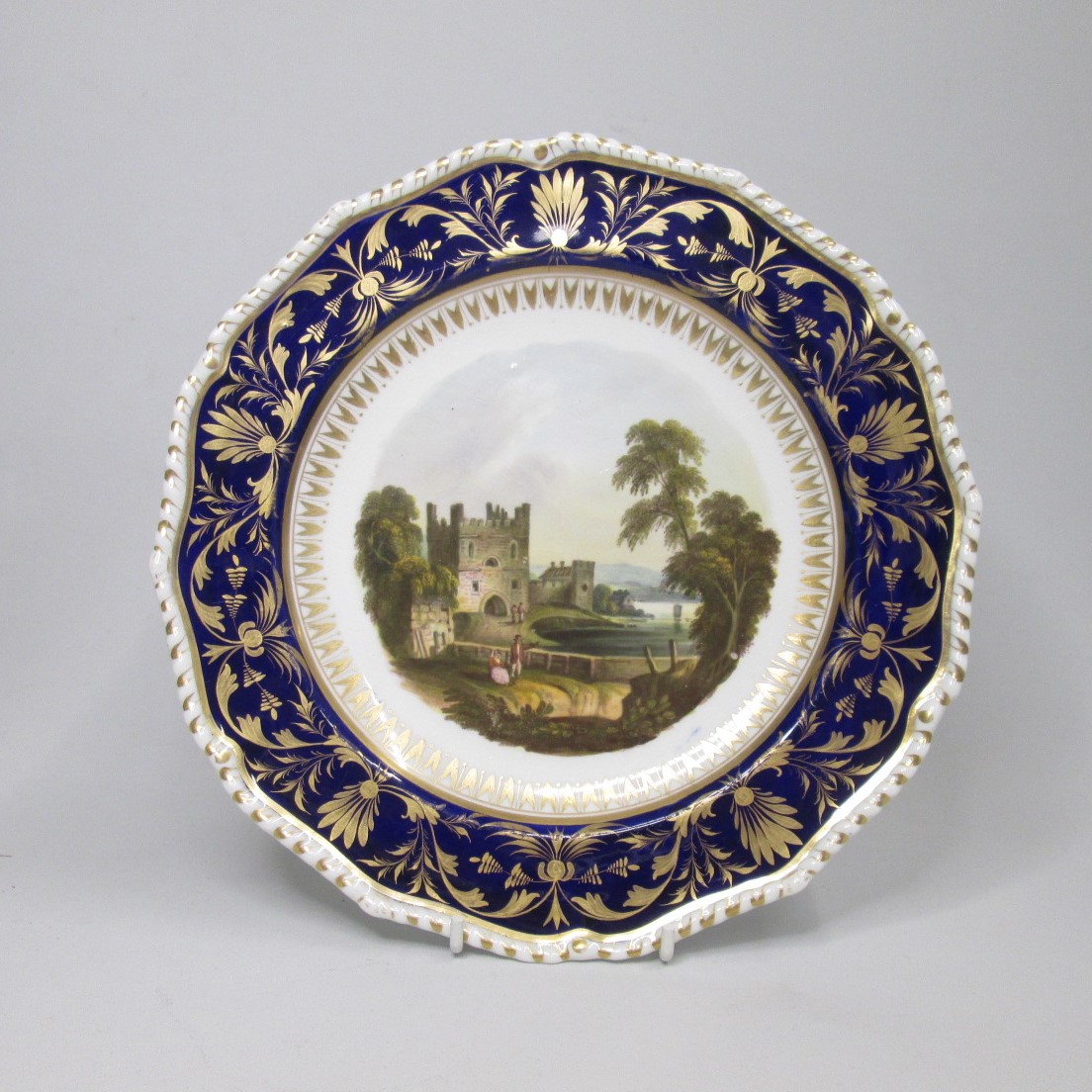 Bloor Derby Porcelain plate decorated with a blue and gilt border with a scene titled Bywell Castle, Circa 1820.