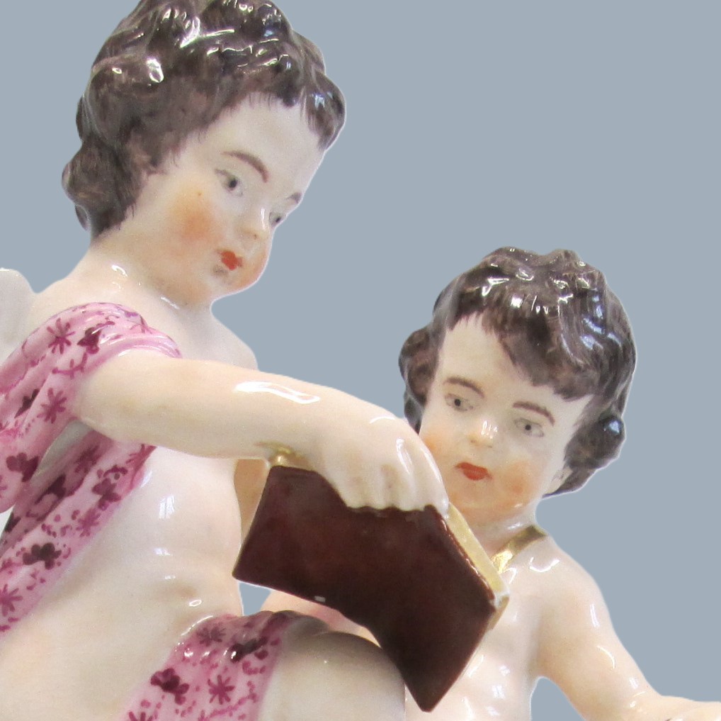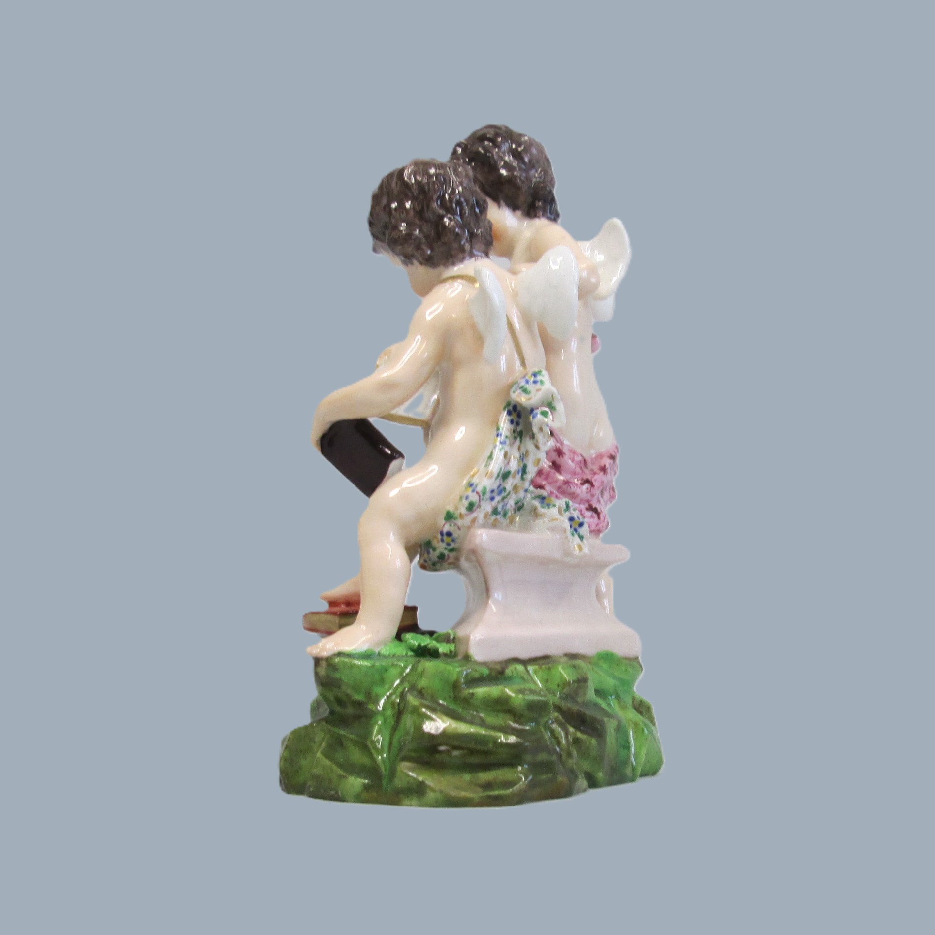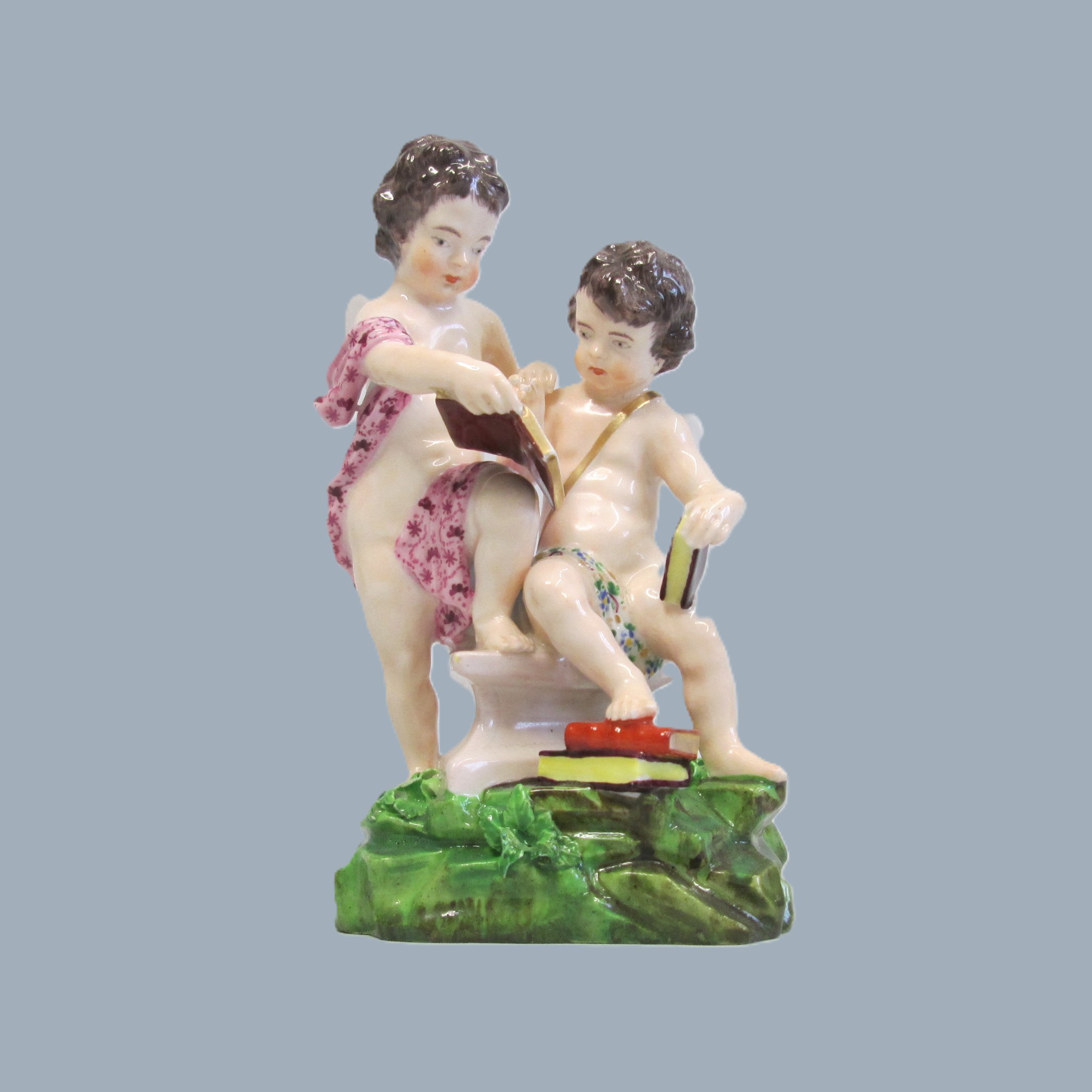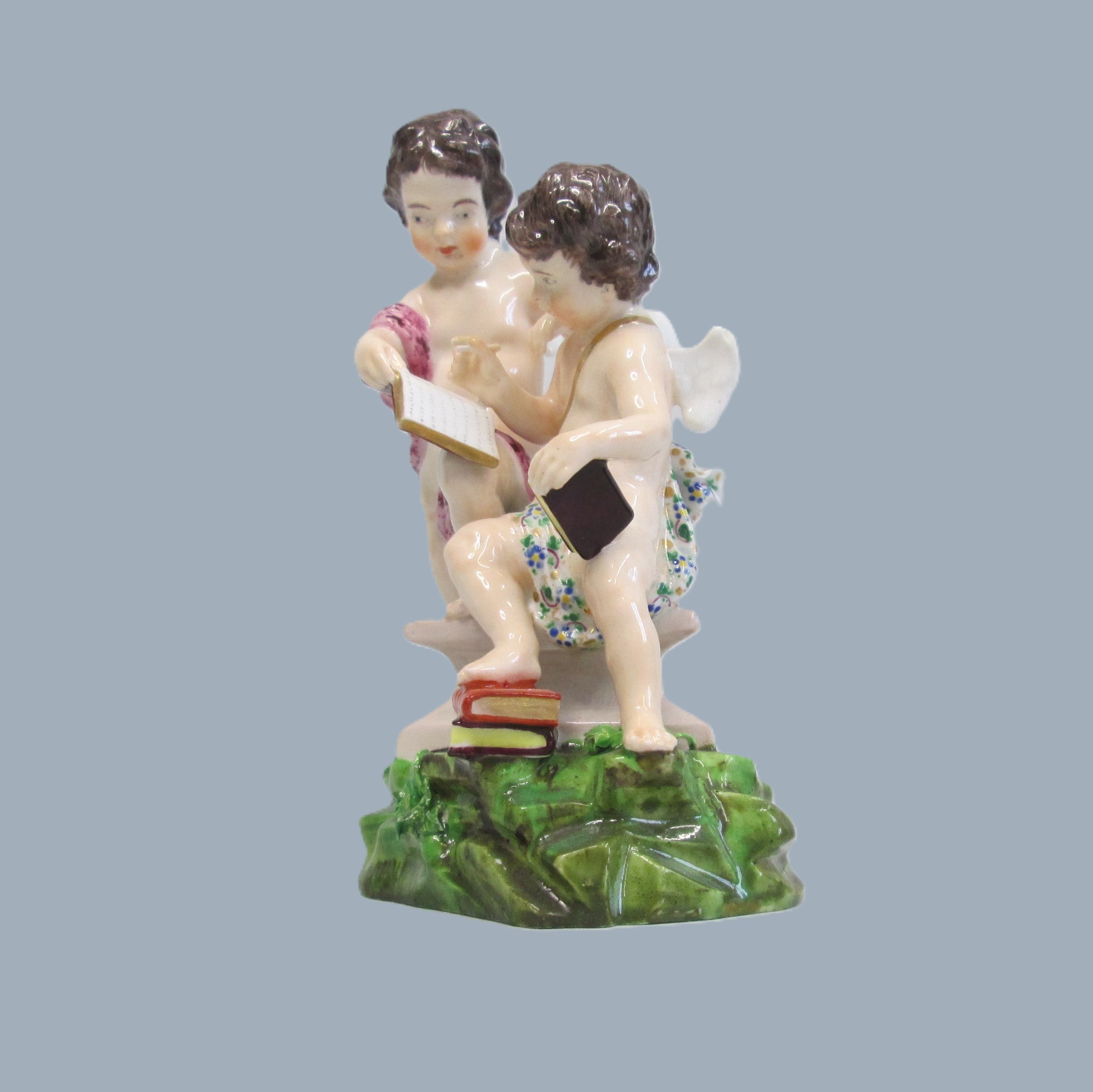 A Rare Bloor Derby group of two Cherubs representing Literature one Cherub is holding a book in his left hand while writing in a book held by the other Cherub.